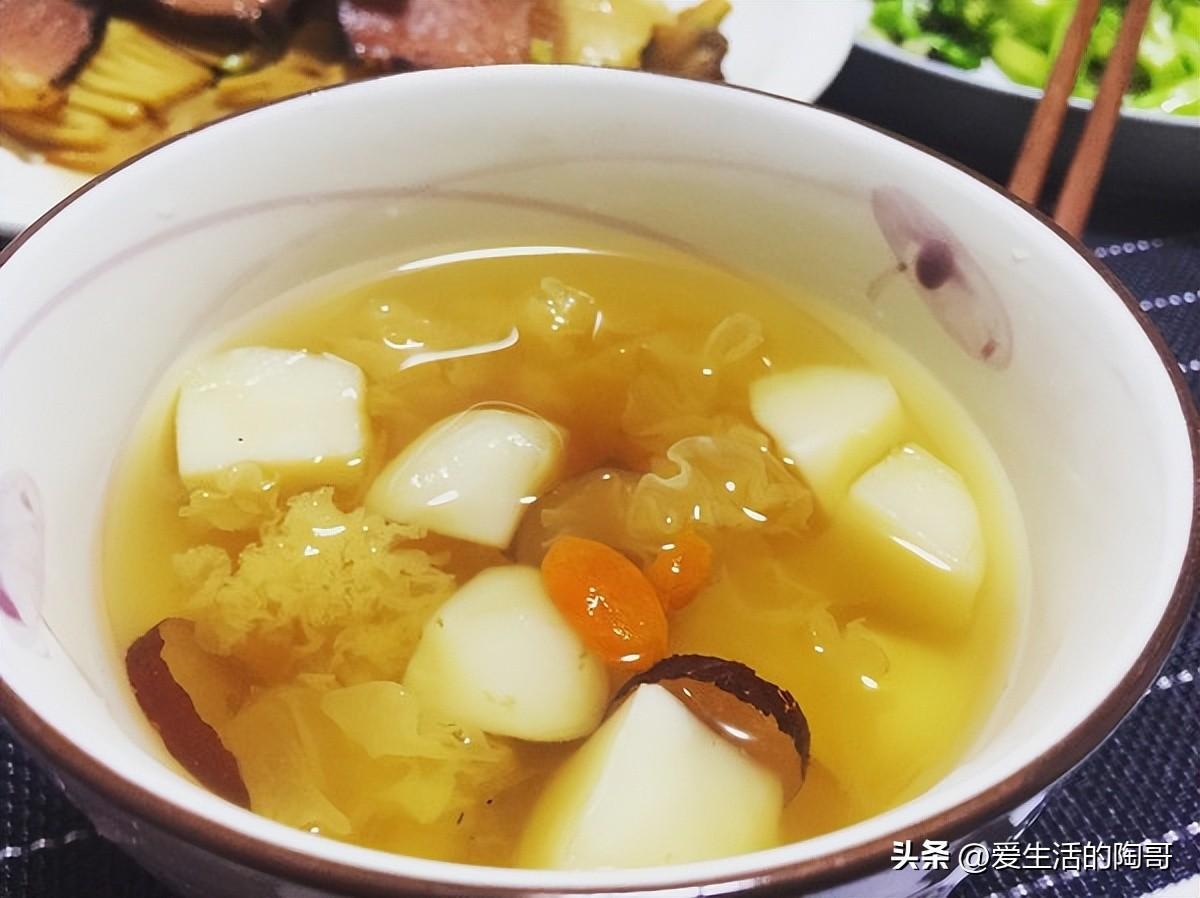 馬蹄也叫荸薺,肉白色,口感香甜,營養也高。搭配銀耳一起煮湯喝,營養又好喝,對於我們身體的新陳代謝特別有幫助。湯的裏面再加入大棗,百合, 蓮子,枸杞,不僅顏色好看,營養更加高。