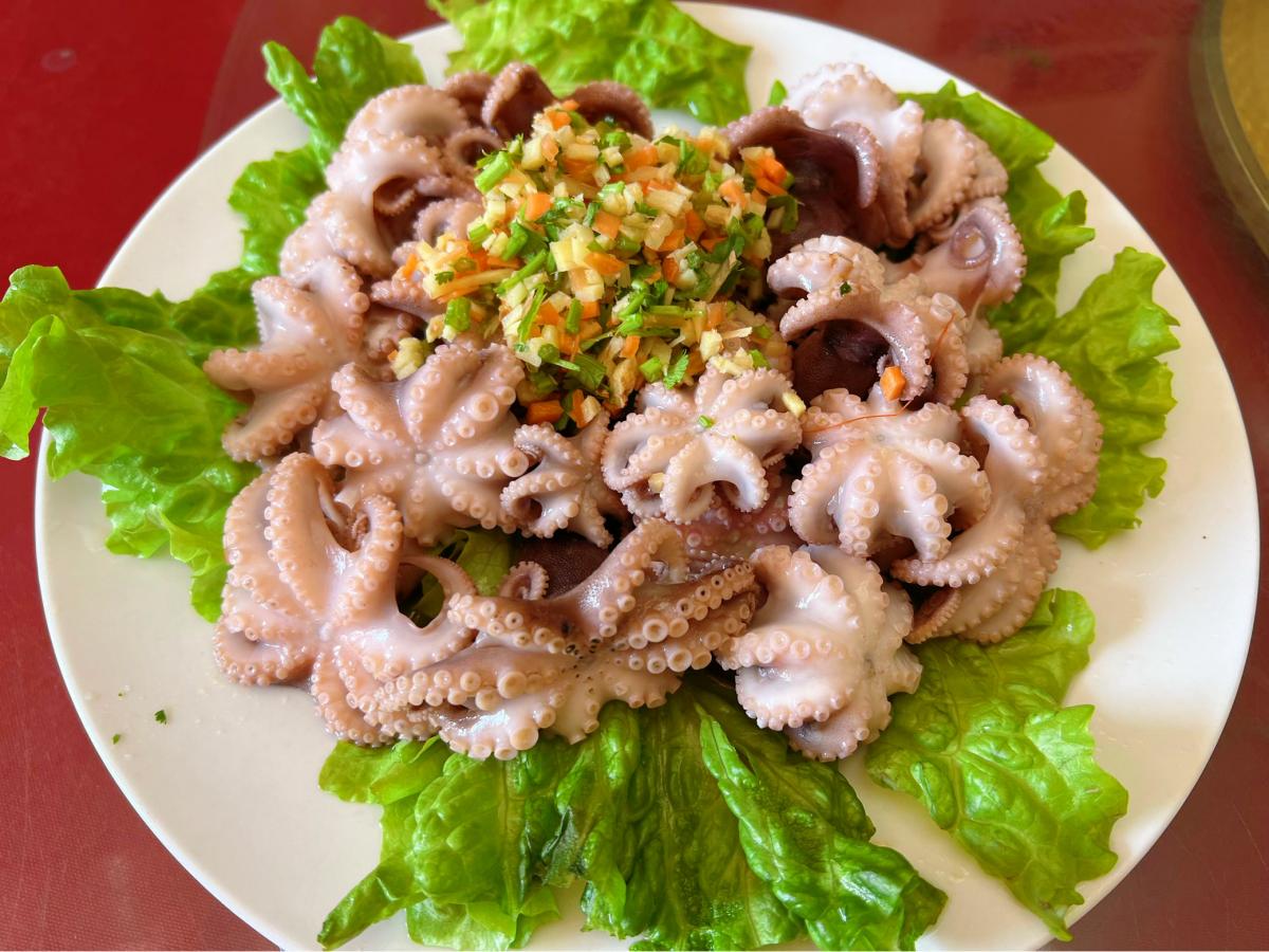 第四道菜:清蒸八爪魚。八爪魚肉質超鮮嫩,而且觸手喫起來有嚼勁,真是讓人回味無窮啊!蒸出來的時候,保留了它原汁原味,再配上一點點蔥薑蒜,香氣四溢,那味道簡直讓人垂涎三尺!