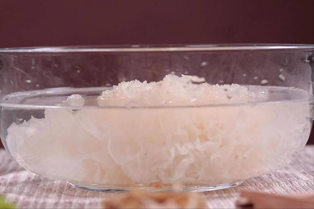 2、泡好後的銀耳,下面有一塊硬硬的、發黃的根,這個部分需要去掉,然後再把銀耳撕成小塊。注意,撕銀耳的時候,一定要越小越好、越碎越好,這樣煮的話,更容易煮出來膠質,這是第一個重點。