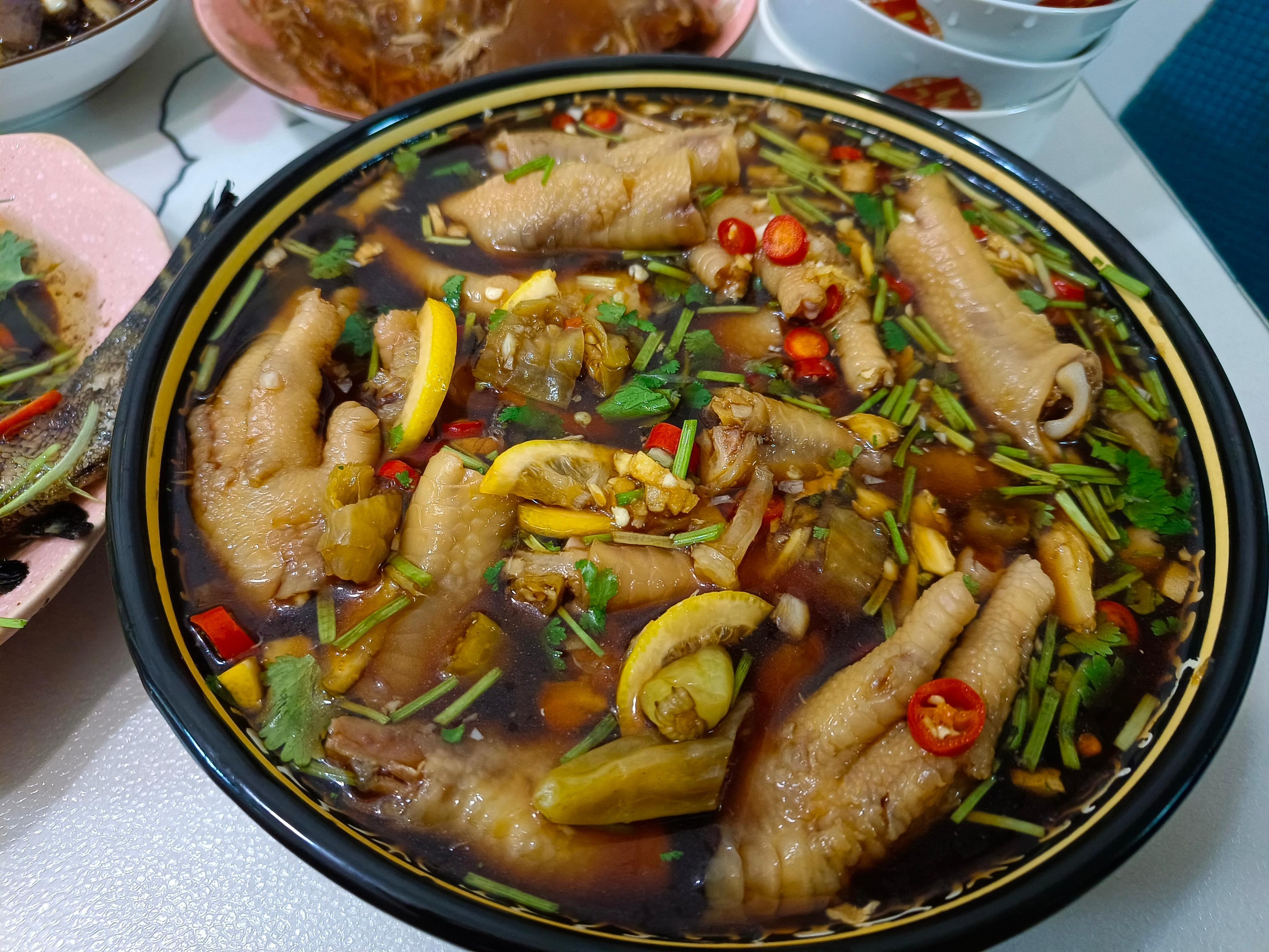 這道菜酸爽開胃,喫完紅燒肉再來上一口它,特爽口,很是合我的胃口!我還特意跟嫂子學了做法:先把雞爪洗乾淨成小塊,然後冷水下鍋後,加入適量的料酒和薑片煮大約15分鐘,煮好的雞爪撈出後放到冰水中浸泡10分鐘左右,再控水撈出裝盤,然後加入香菜、小米辣、檸檬片等配菜,接着加入適量的鹽、白糖、1勺蠔油、4勺生抽、4勺陳醋、少許香油和適量的純淨水或涼白開水,攪拌均勻後再放到冰箱中冷藏三四個小時,就可以拿出來開喫了。