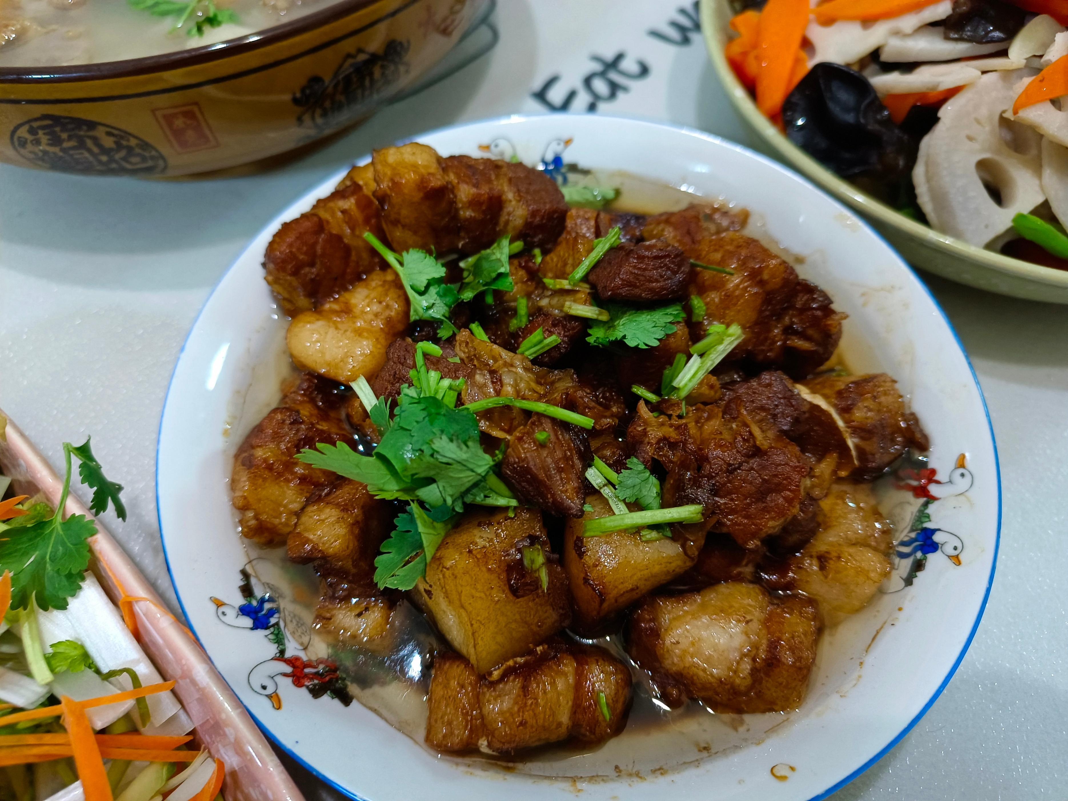 嫂子做的這道紅燒肉真是色香味俱全,喫起來肥而不膩,瘦而不柴,喫到嘴裏的口感細膩軟爛,彷彿在味蕾上跳舞,讓你喫一口就想喫第二口,就連我這個平時不喫肥肉的人都禁不住誘惑,連喫了四五塊,兒子平時就愛喫紅燒肉,這下更是過足了癮。