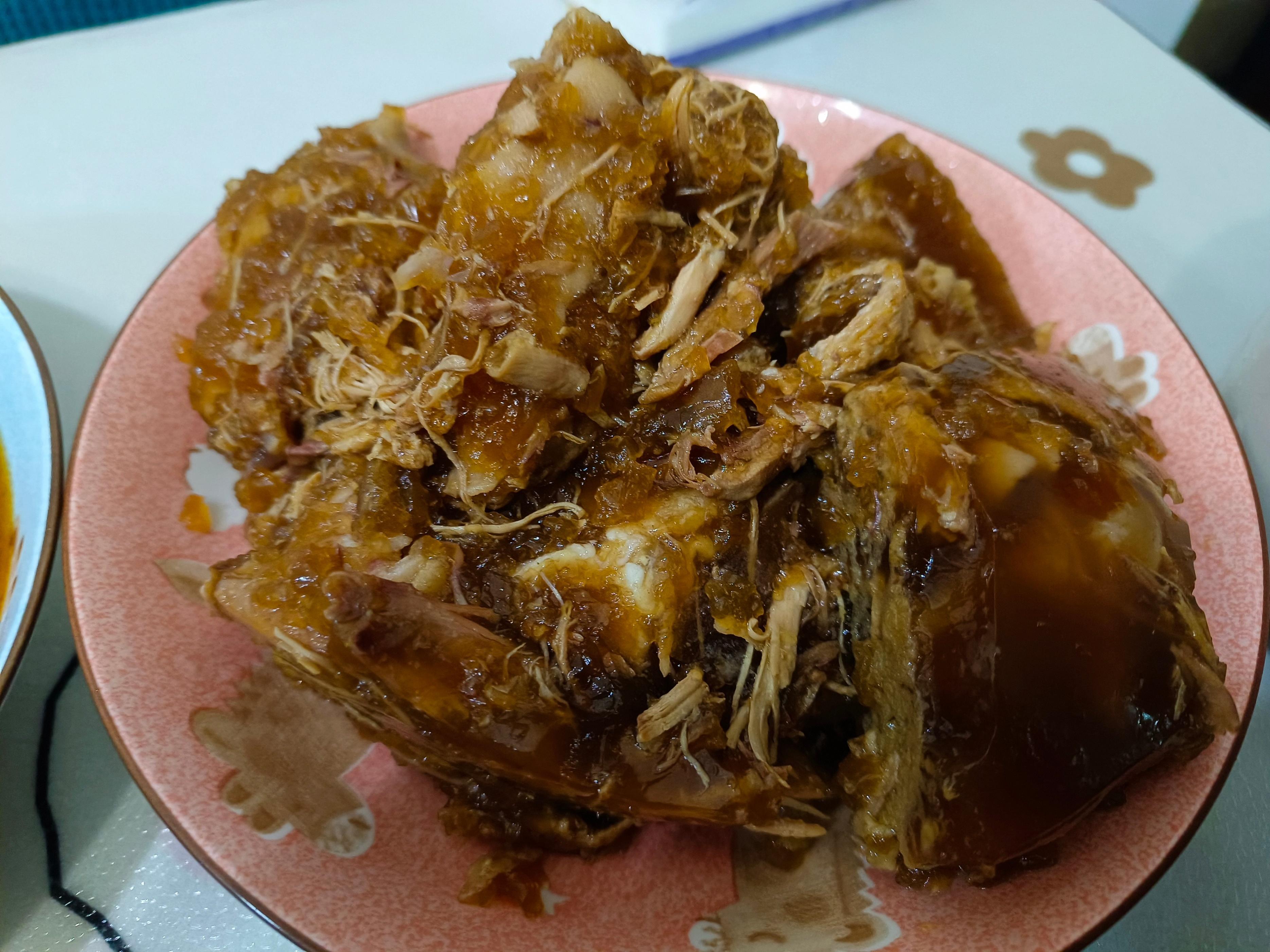 這道菜是山東人過年都喜歡做的一道菜,是用雞肉和豬蹄熬成的湯凝結而成的,做好後把它放到冰箱中保存,家裏來客人的時候,挖出來一盤,喫起來冰冰涼涼的,很是清爽開胃,嫂子每年都會做一盆,每次還都會給們帶一小盆回家喫,有個這麼好的嫂子真是幸福!