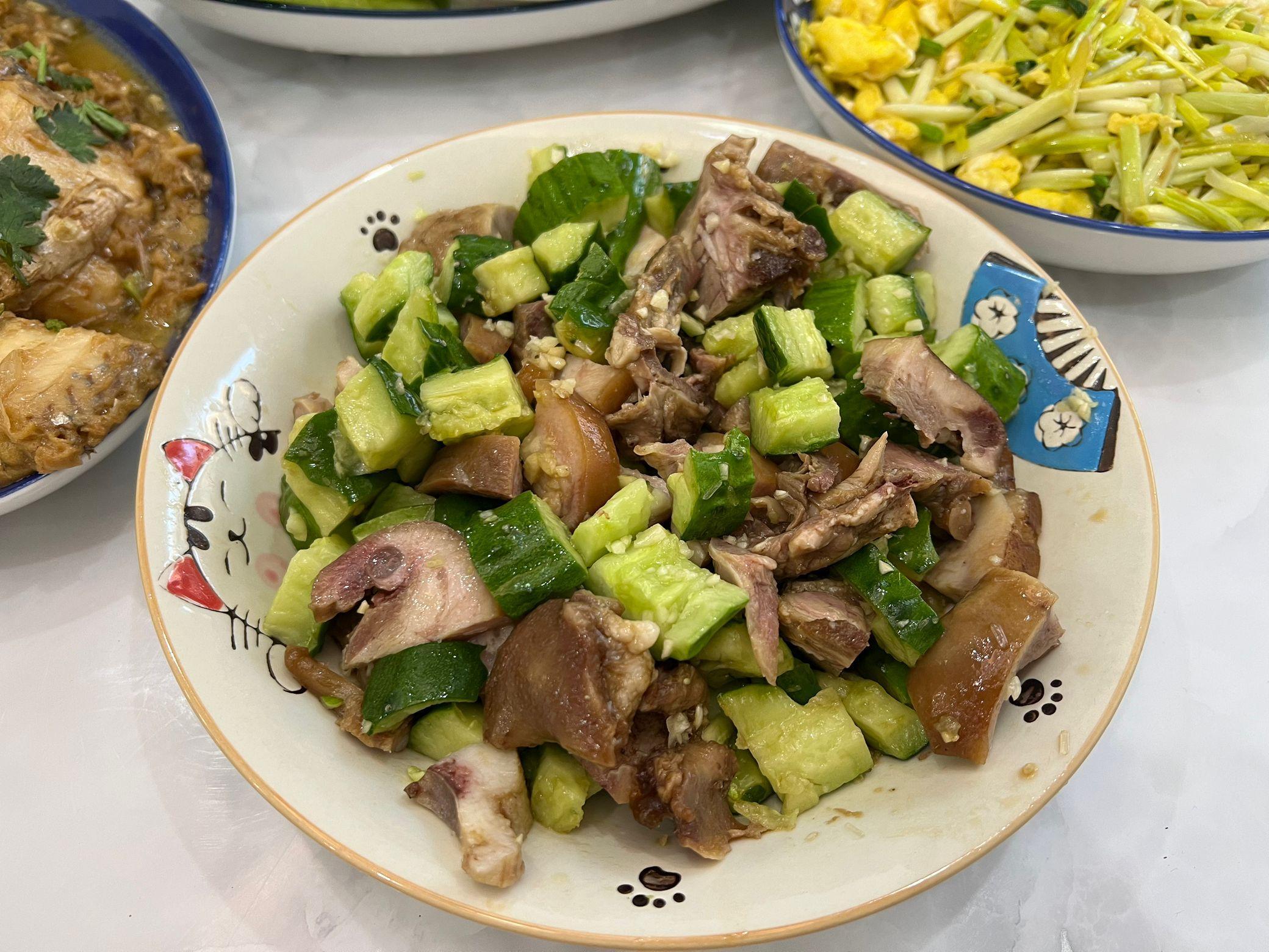 4、豬頭肉拌黃瓜,咬一口,清香爽口,簡直讓人慾罷不能!做法:把豬頭肉放開水裏煮熟,撈出來切絲備用。黃瓜洗淨切成絲或小塊。再把蔥、姜、蒜切碎,辣椒切碎,香菜切段,準備一碗調味汁,裏面放醋、生抽、鹽、糖、香油,攪拌均勻備用。接着,把切好的黃瓜放碗裏,倒入調味汁攪拌均勻。再把煮好的豬頭肉絲放進去,撒上蔥薑蒜、辣椒、香菜,攪拌均勻,真香!