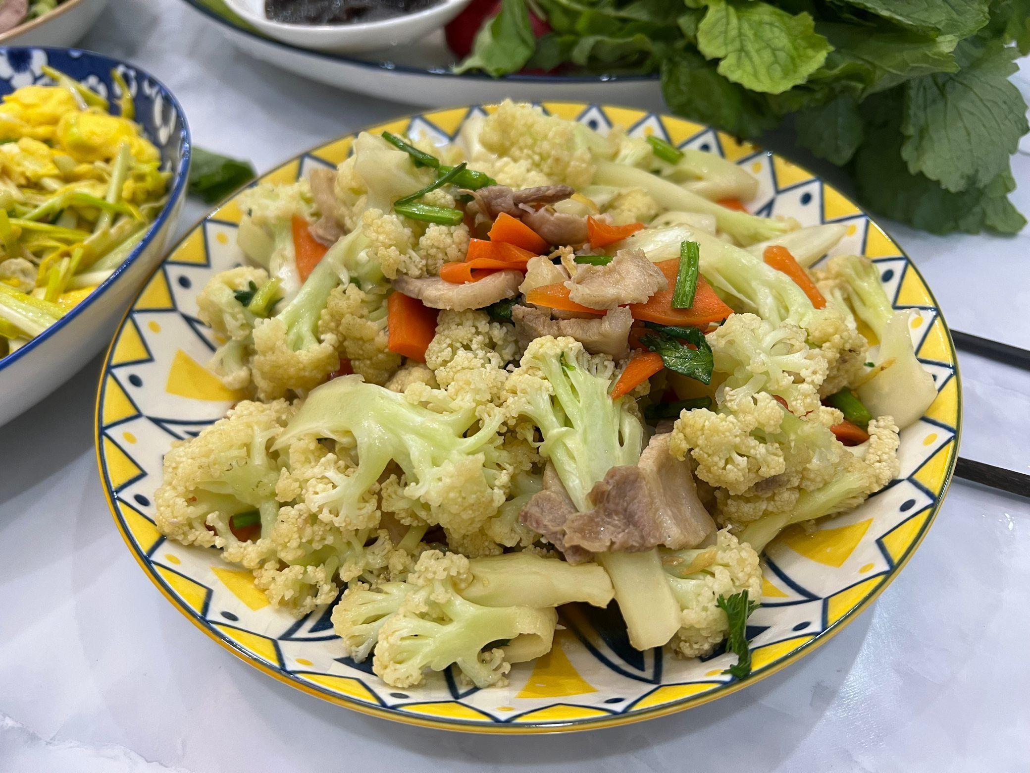 第二道菜:花菜炒肉是一道簡單而美味的家常菜,其製作簡便,口感清爽,是許多家庭喜愛的菜餚之一。做法:準備食材:將花菜洗淨後切成小朵,豬肉切成薄片,蔥薑蒜切成末備用。熱鍋涼油,加入蔥薑蒜爆香。放入豬肉片翻炒至變色。加入花菜朵繼續翻炒,約炒2分鐘。調入適量料酒、生抽、鹽、胡椒粉等調味料,繼續翻炒均勻至熟。菜餚炒熟後即可出鍋,上桌享用。