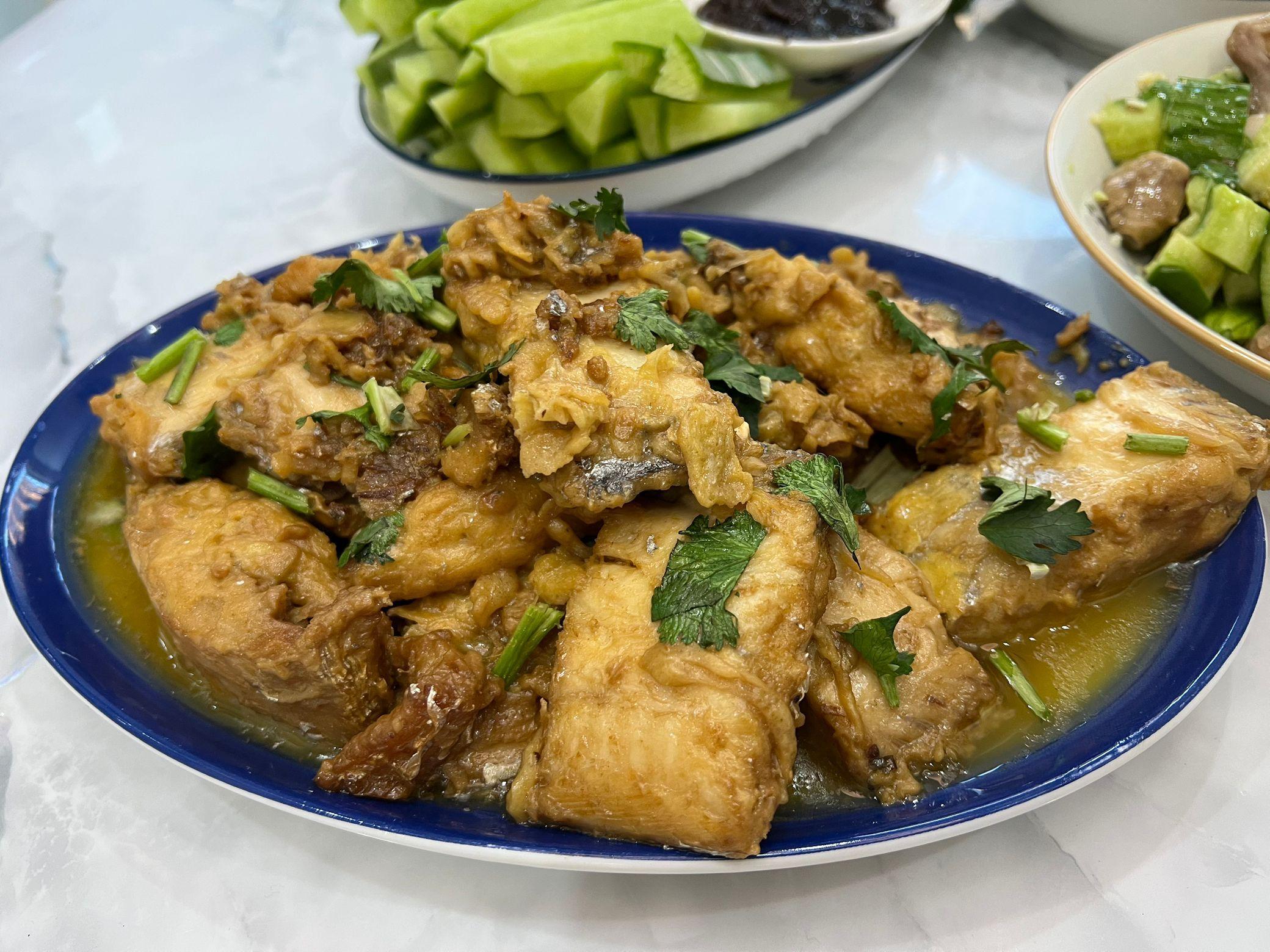 第一道是醬燜帶魚,這是全桌上最貴的一道菜了,帶魚買的是特別新鮮的那種60元一條,對於做海鮮,我們膠東特色就是醬燜,比如醬燜黃花魚,醬燜鮁魚,特色就是熱油把麪醬炸香後再下入魚肉,這樣做出來更入味,而且沒有腥氣。