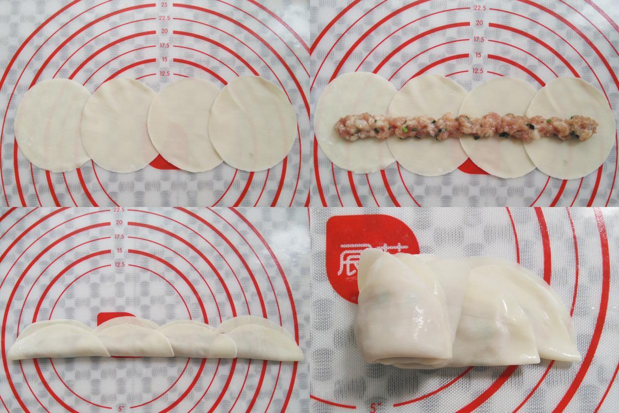 取4張餃子皮,從左往右邊緣要依次疊起來,中間放上適量的香蔥豬肉餡,餃子皮下端往上翻蓋住肉餡,不封口,從左往右把餃子皮捲起來,貼合的地方抹一點水更好。