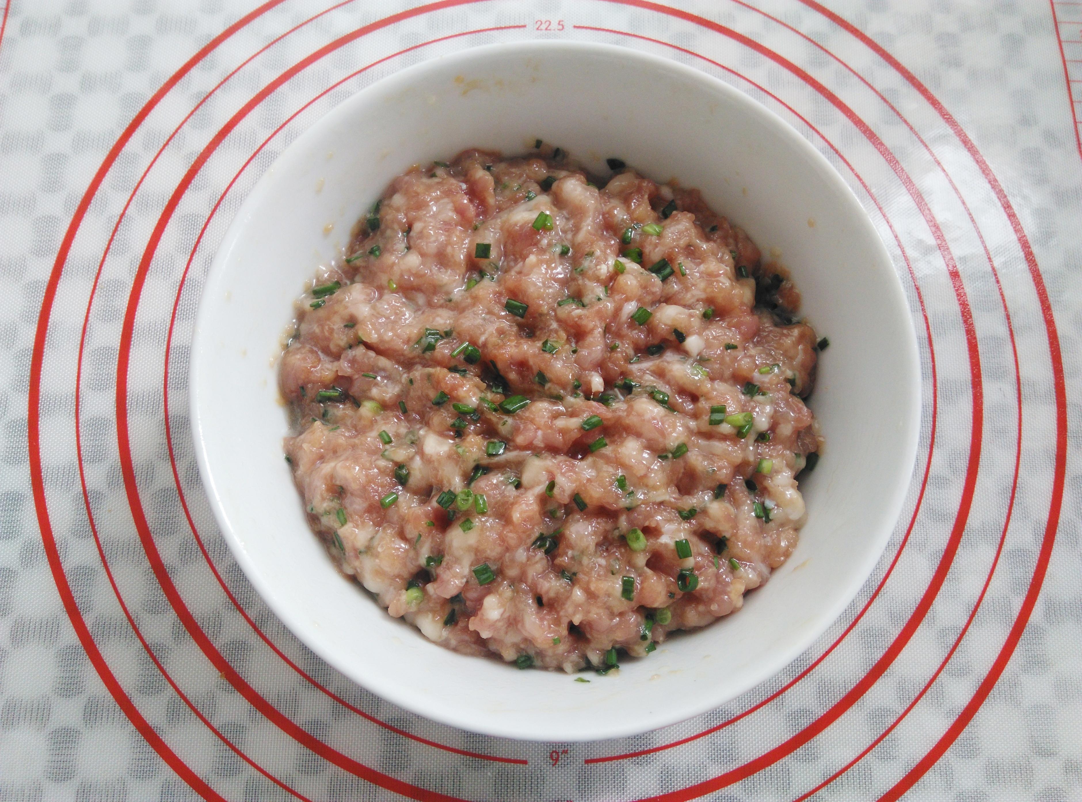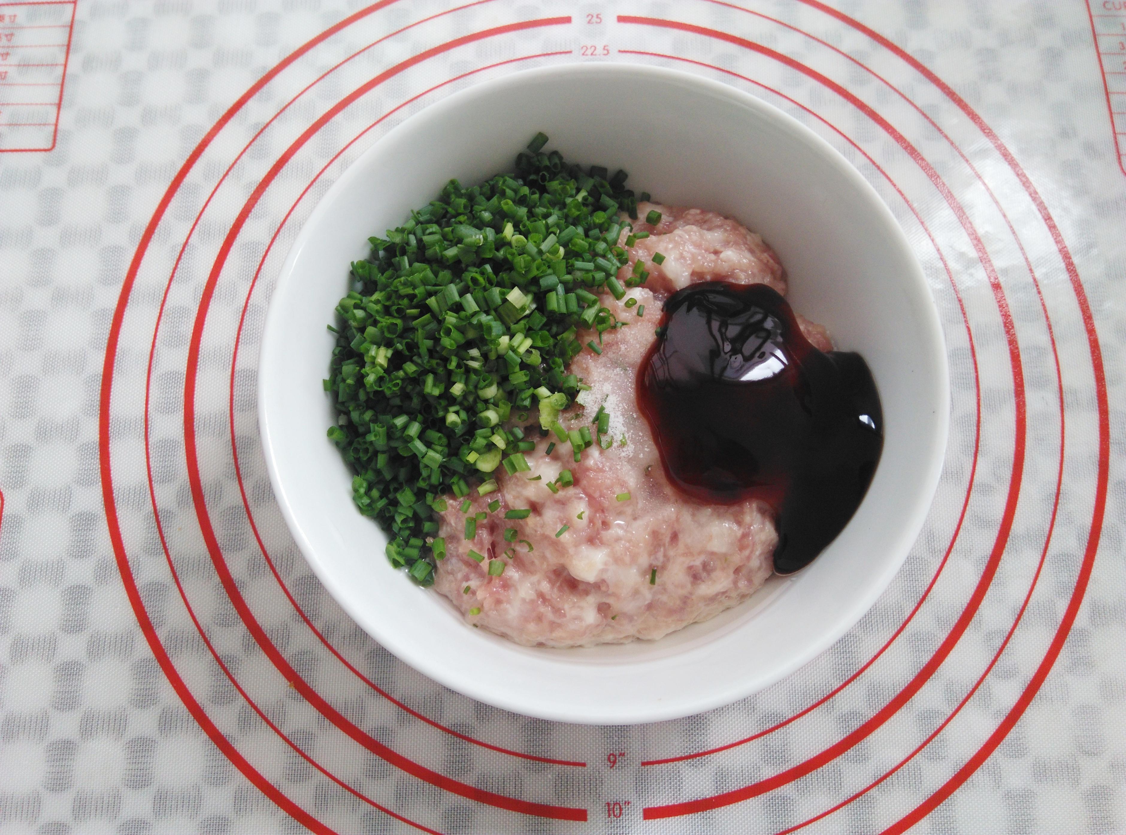 香蔥只要葉子,切成小顆粒,放入豬肉末中,按照個人口味加入生抽、蠔油和鹽混合均勻。香蔥葉子可以換成韭菜或者其他喜歡的食材。