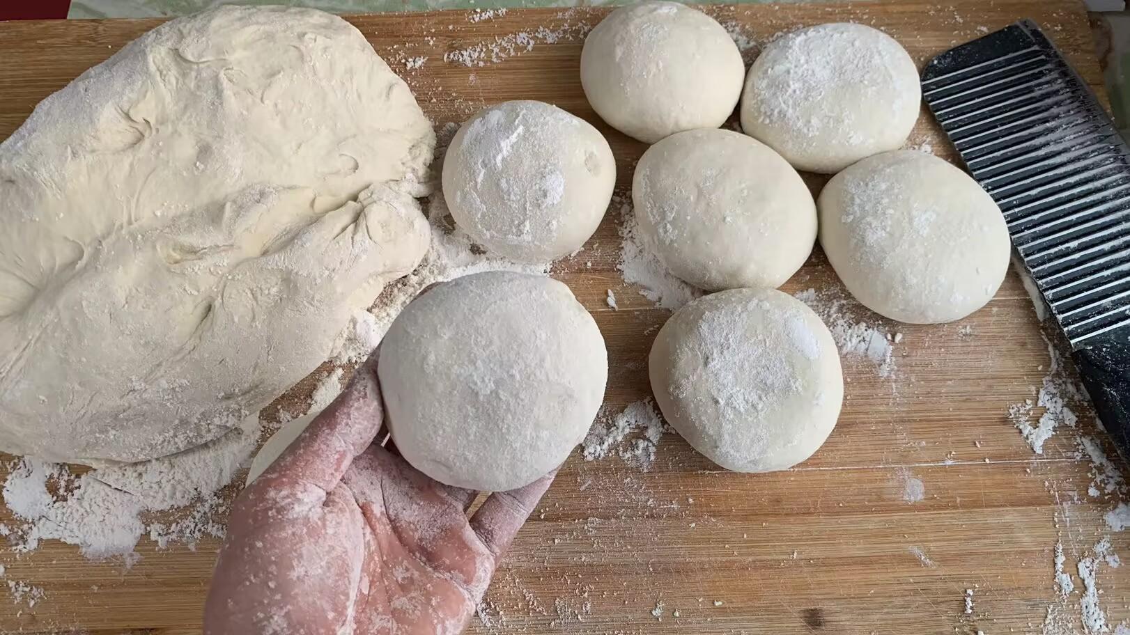 4、面發好後拿出來多揉一會,一定要把裏面氣體排乾淨,這樣包出來的包子麪皮纔會更細膩,沒有那麼多蜂窩眼。揉好後把面搓成長條,再切成同等大小的面劑,然後按扁,一個個擀成中間稍厚,邊緣稍薄的麪皮。