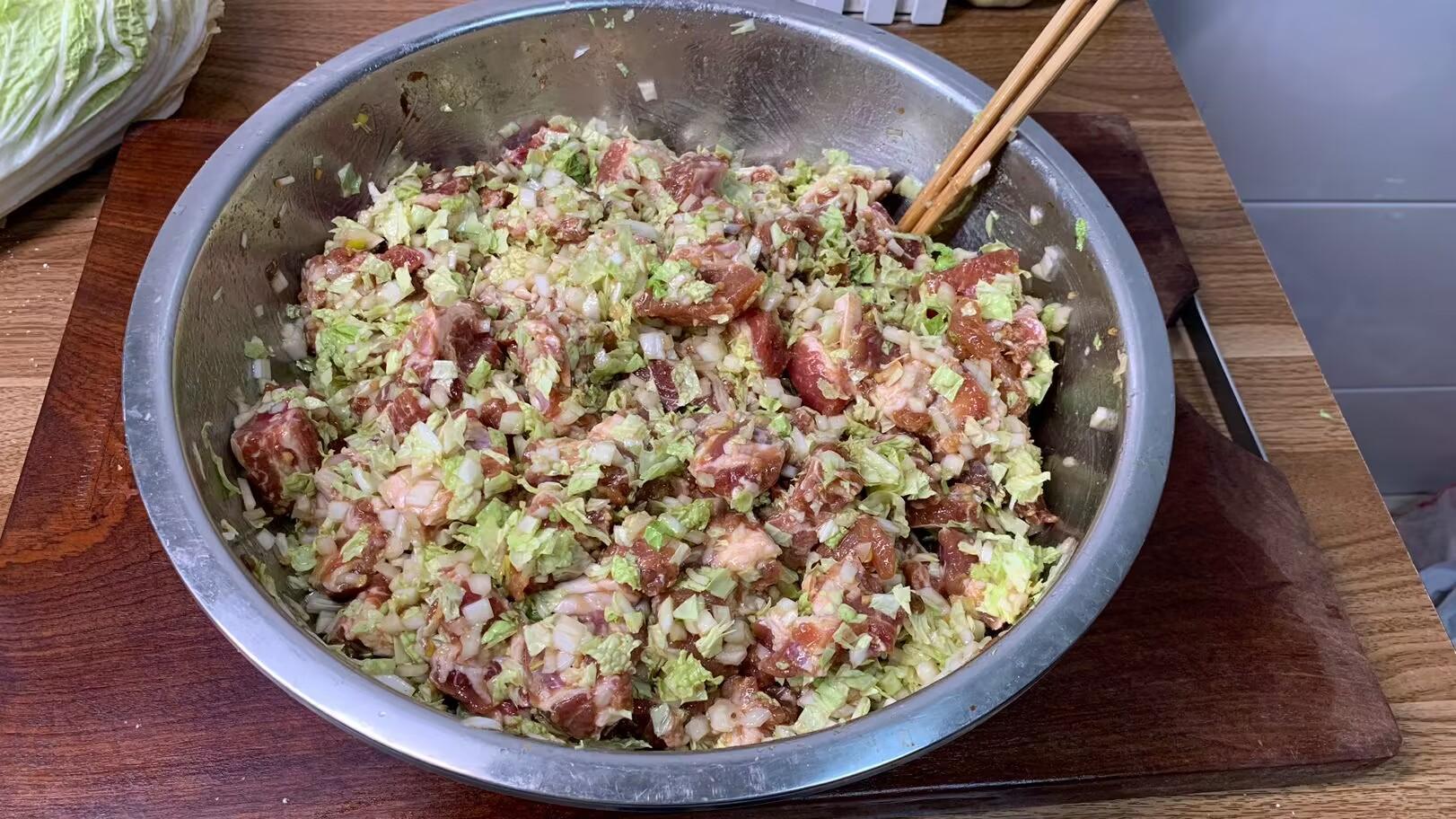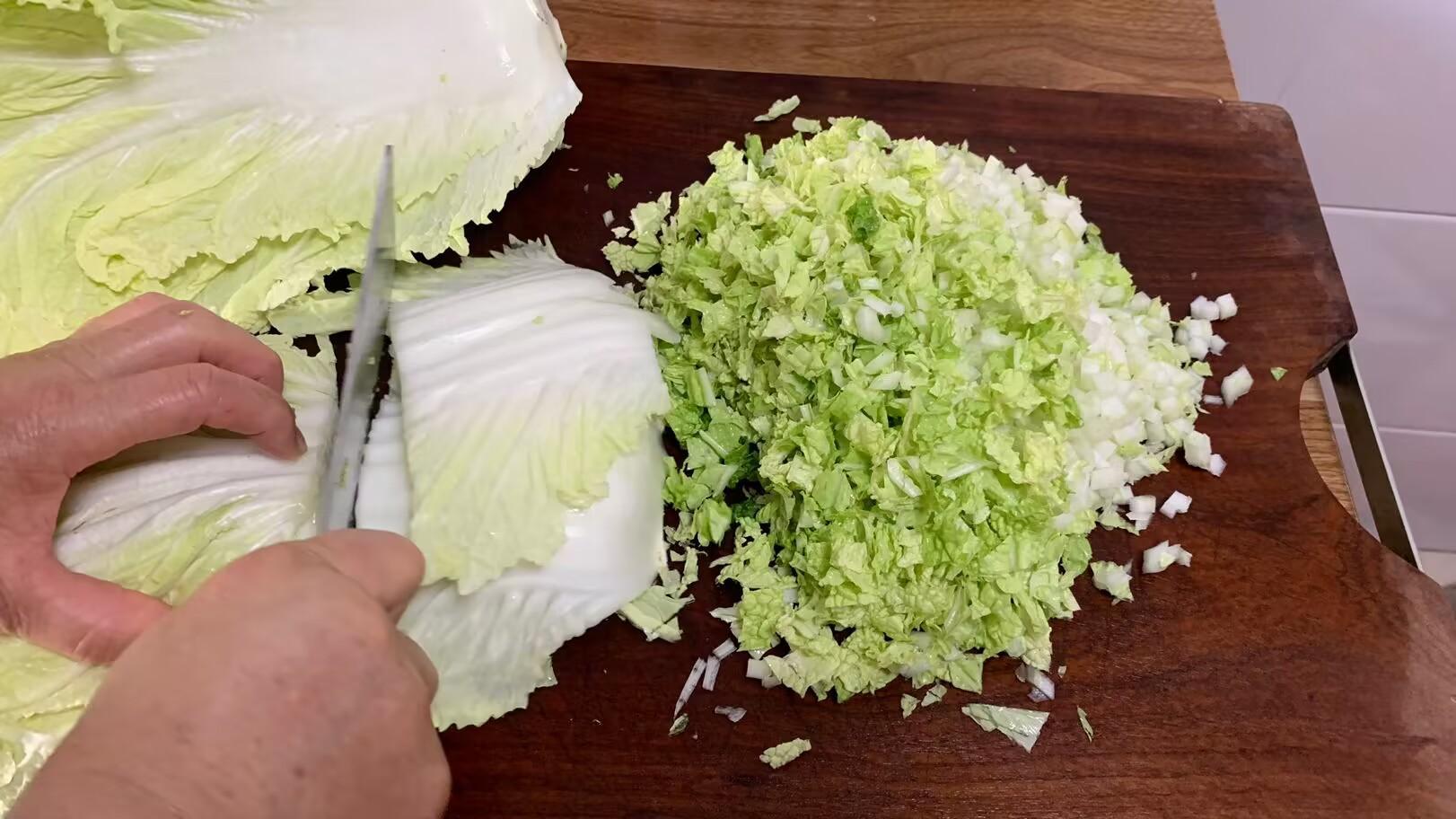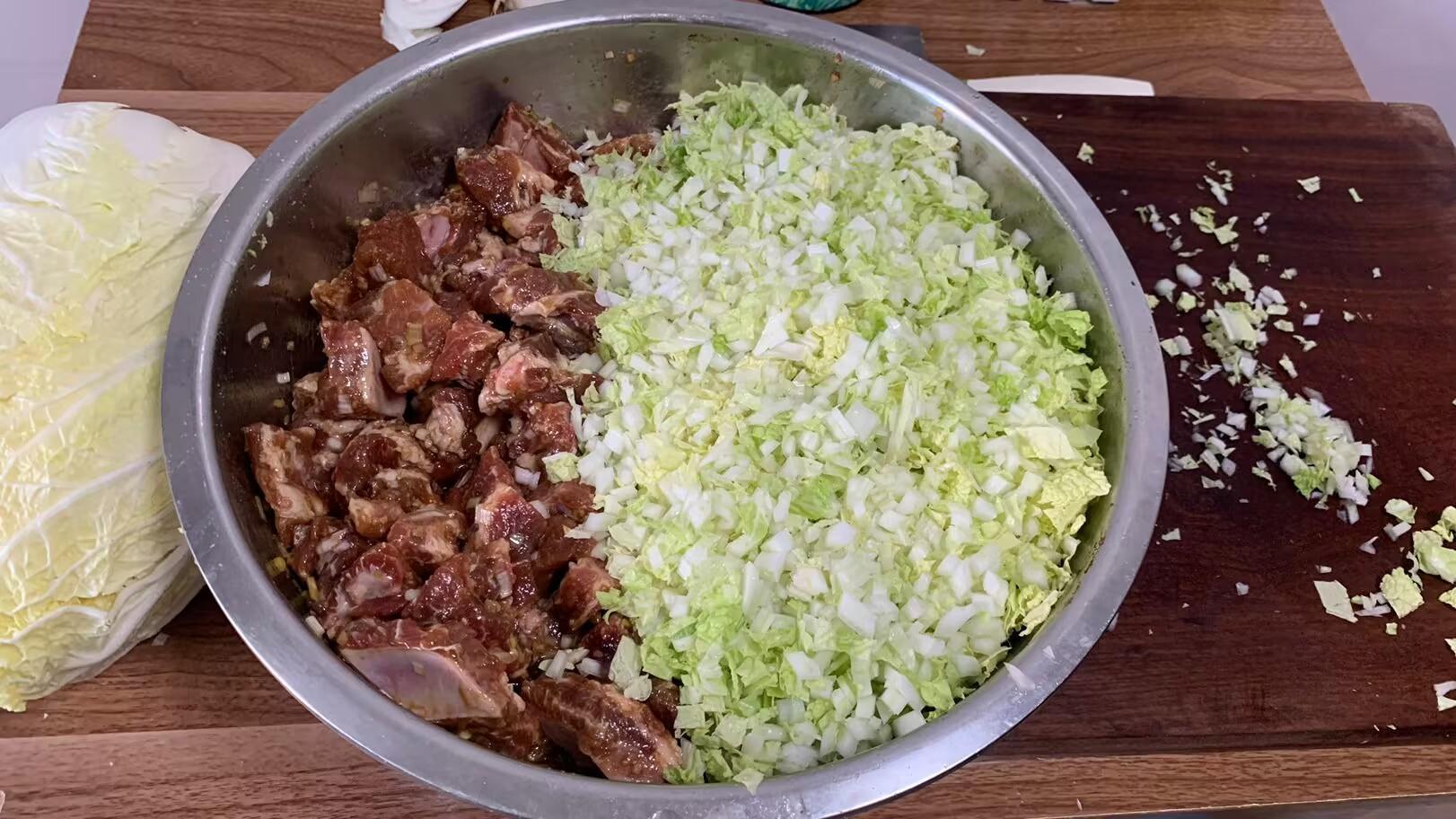 2、洗淨的排骨攥幹水分,加入蔥薑末和老麪醬,老麪醬很鹹,所以這裏就不需要再加食鹽了,抓勻後再加上蠔油和食用油拌勻,提前醃製兩個小時以上,讓排骨更入味。趁這個時間把白菜葉子一片片洗淨控水,切成小丁,包之前混合在一起,放早了以免白菜會殺出水。