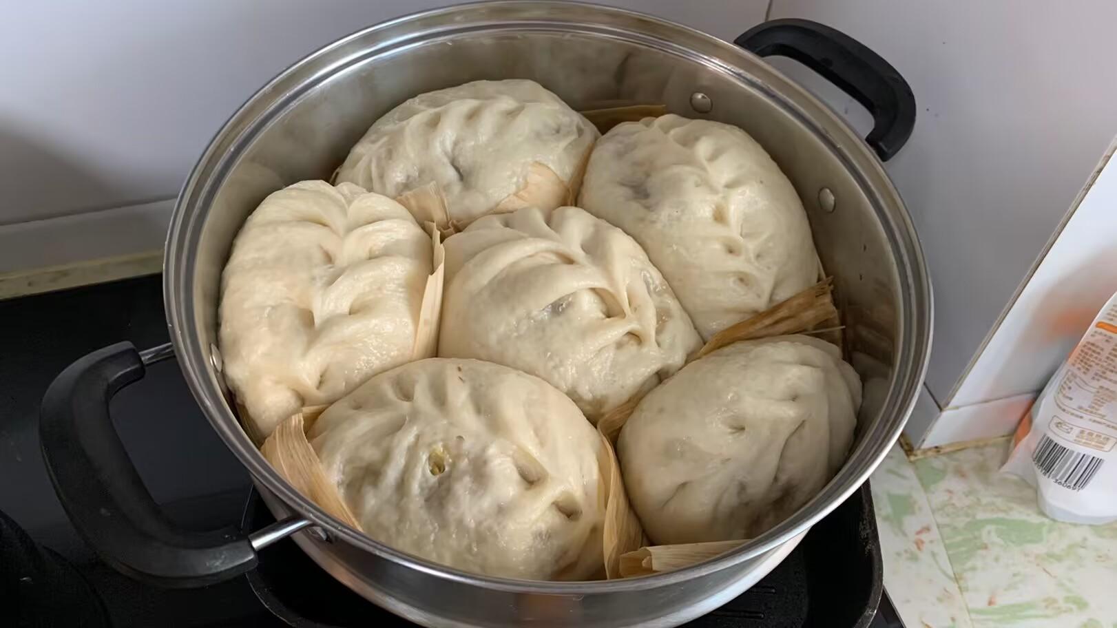 6、包好的包子墊上玉米皮,放進蒸鍋蓋上蓋醒二十分鐘。一定要等再次醒發,不能直接蒸,要不包子發不起來,就成死麪包子了,這也是麪皮鬆軟的關鍵。水開後再蒸三十分鐘,之後再燜5分鐘,這樣包子皮就不容易回縮了,看起來又白又亮。