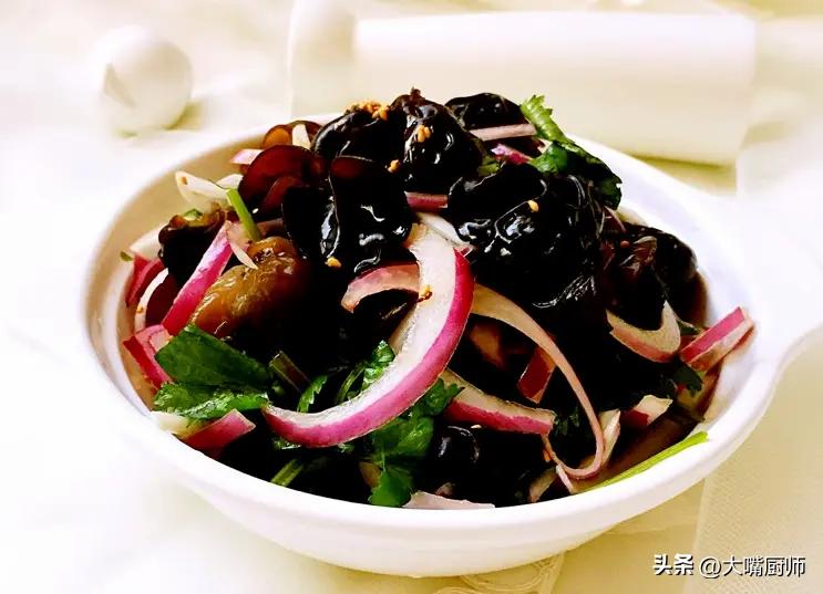 準備黑木耳、洋蔥、香菜、食鹽、生抽、香醋、雞精、辣椒油。