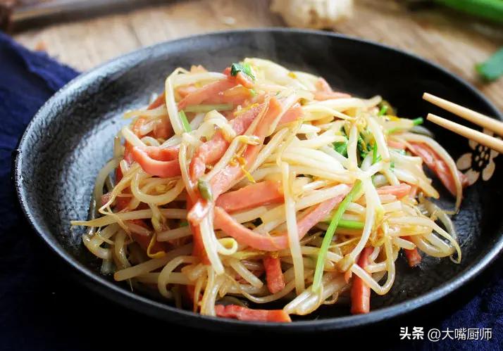 準備綠豆芽、火腿、香菜、香蔥、食鹽、生抽、香醋、蠔油、白糖、食用油。