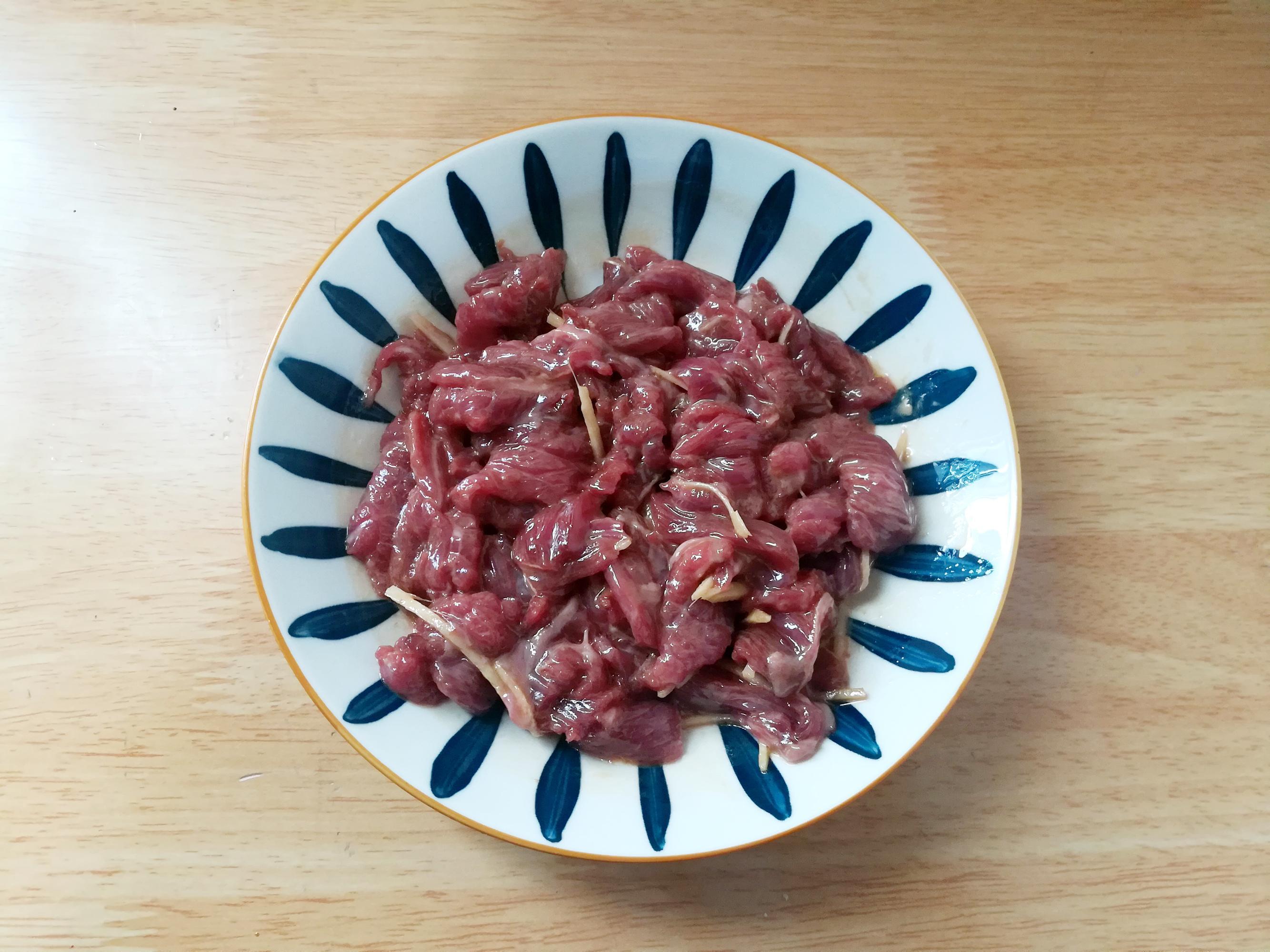 做法:1、牛肉切成薄片,加入料酒,薑絲醃製10分鐘,加一點油鎖住水分。