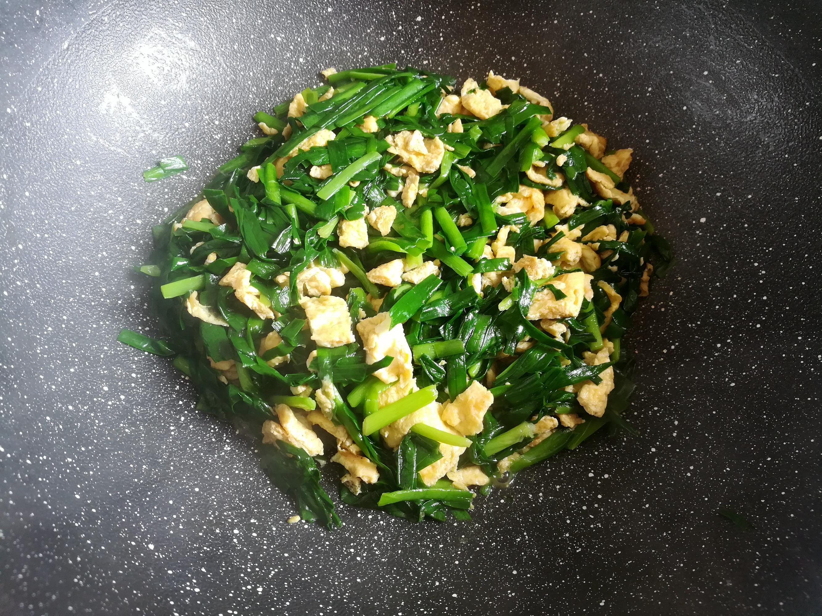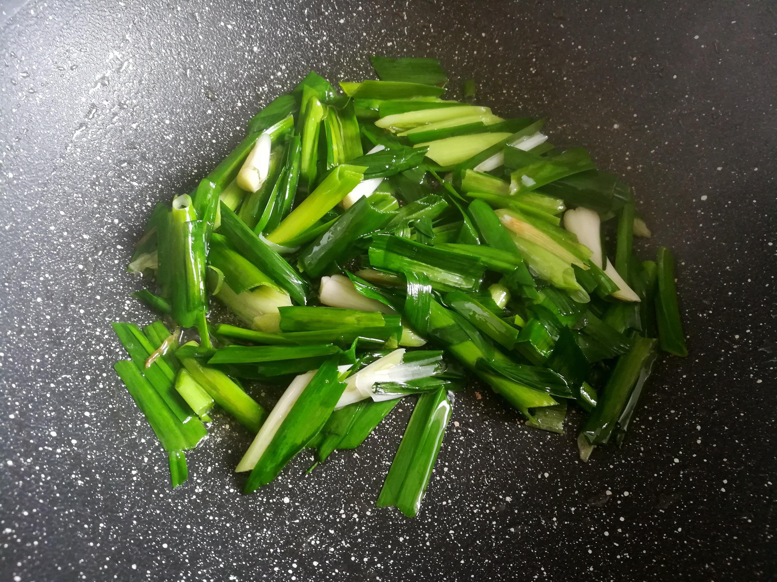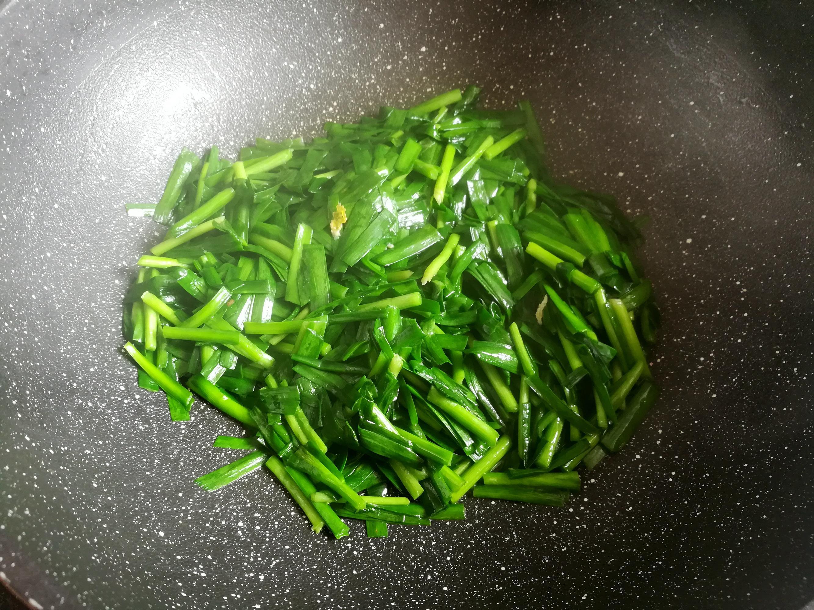 3、鍋裏重新放鹽,放入韭菜翻炒斷生。