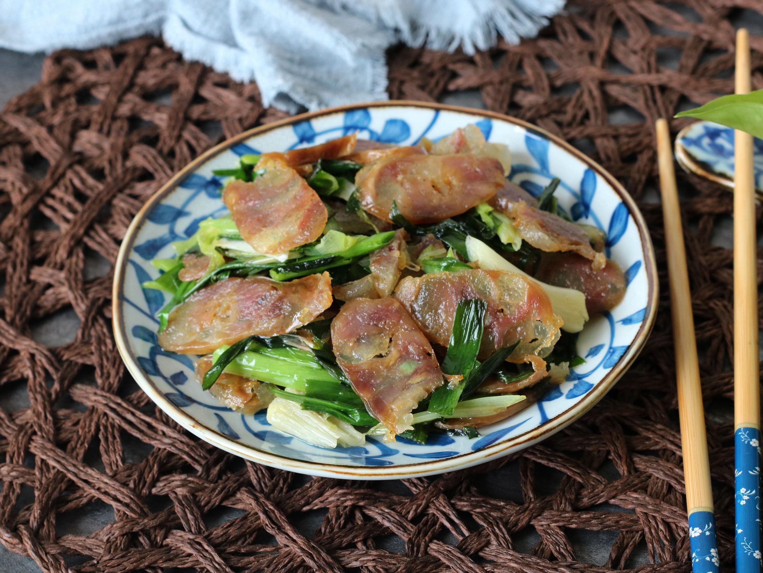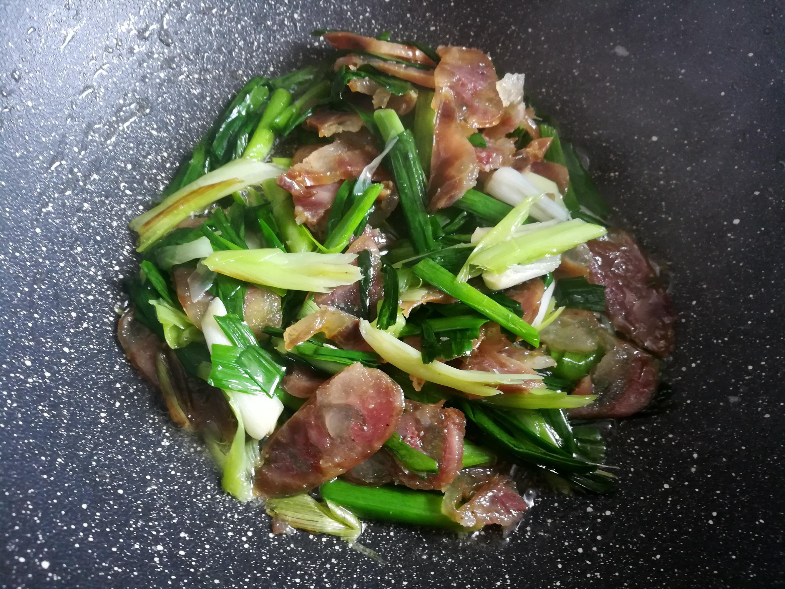 4、加入蒸軟的臘腸,跟香蒜一起翻炒均勻。