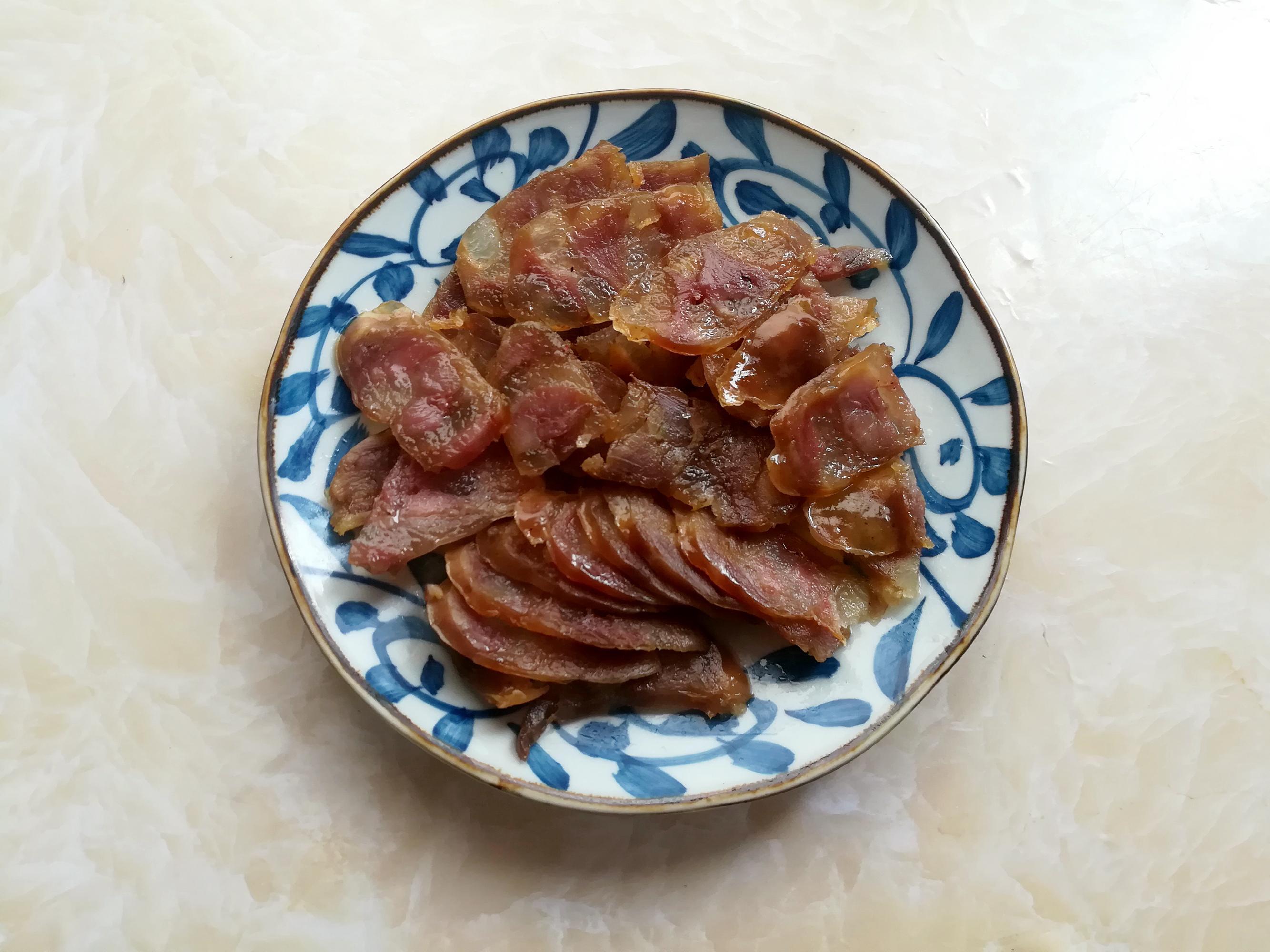 2、臘腸清洗乾淨,切成薄片,隔水蒸軟。