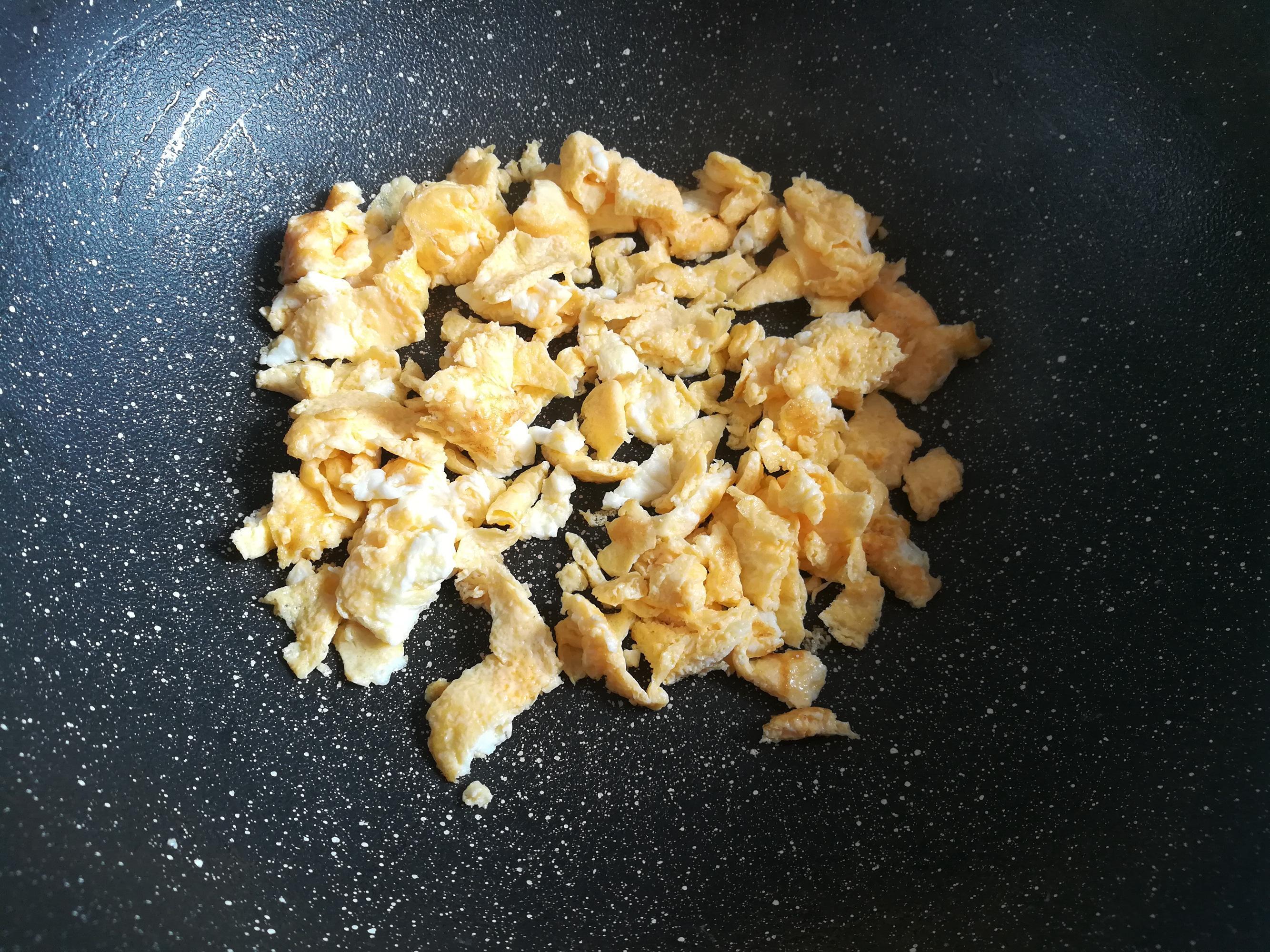 2、雞蛋去殼,蛋清和蛋黃充分攪拌均勻。熱鍋放油,倒入雞蛋液煎到微微凝固,扒拉成小塊盛出來。