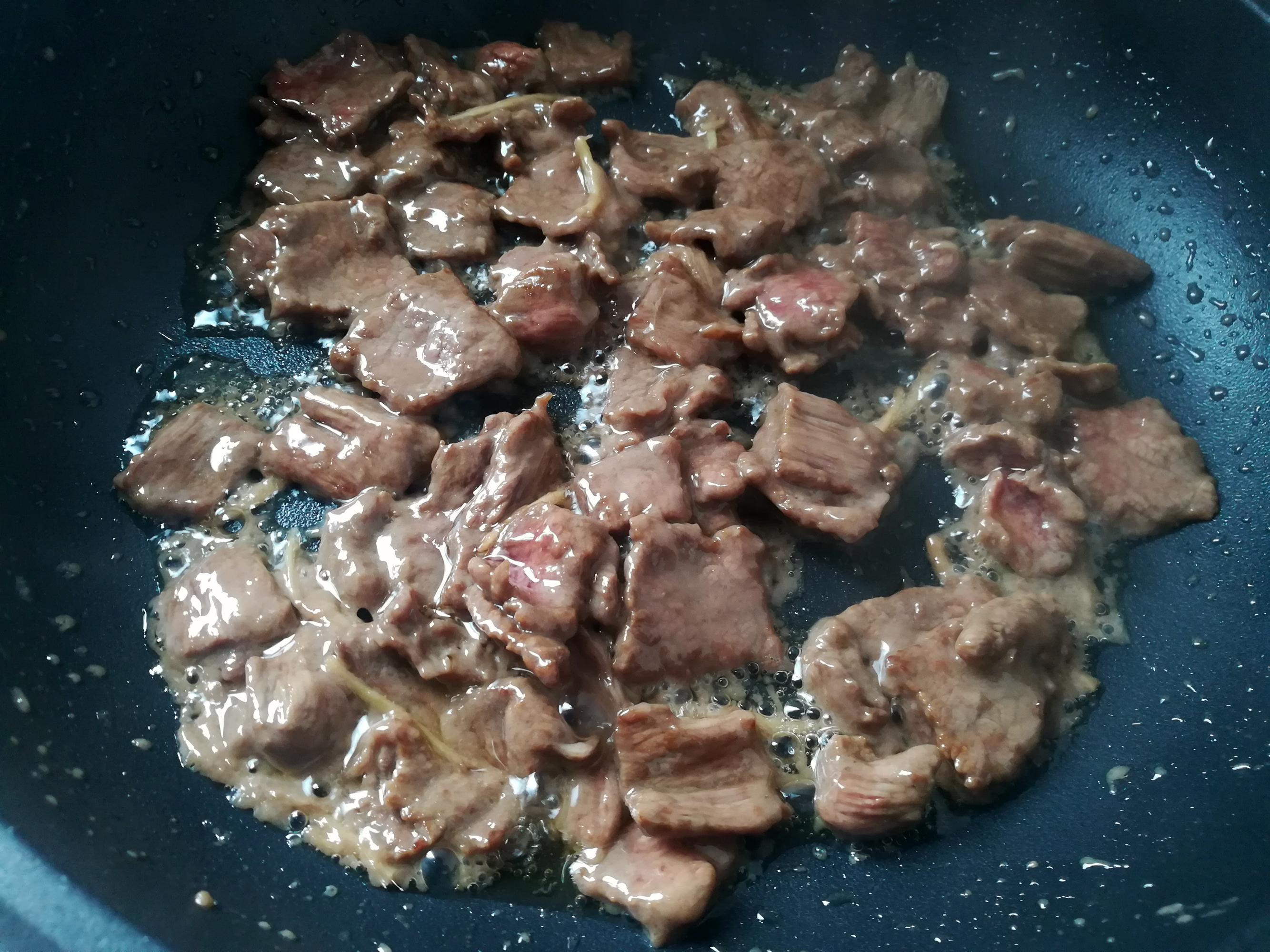 3、熱鍋放油,放入醃過的牛肉翻炒到熟透。