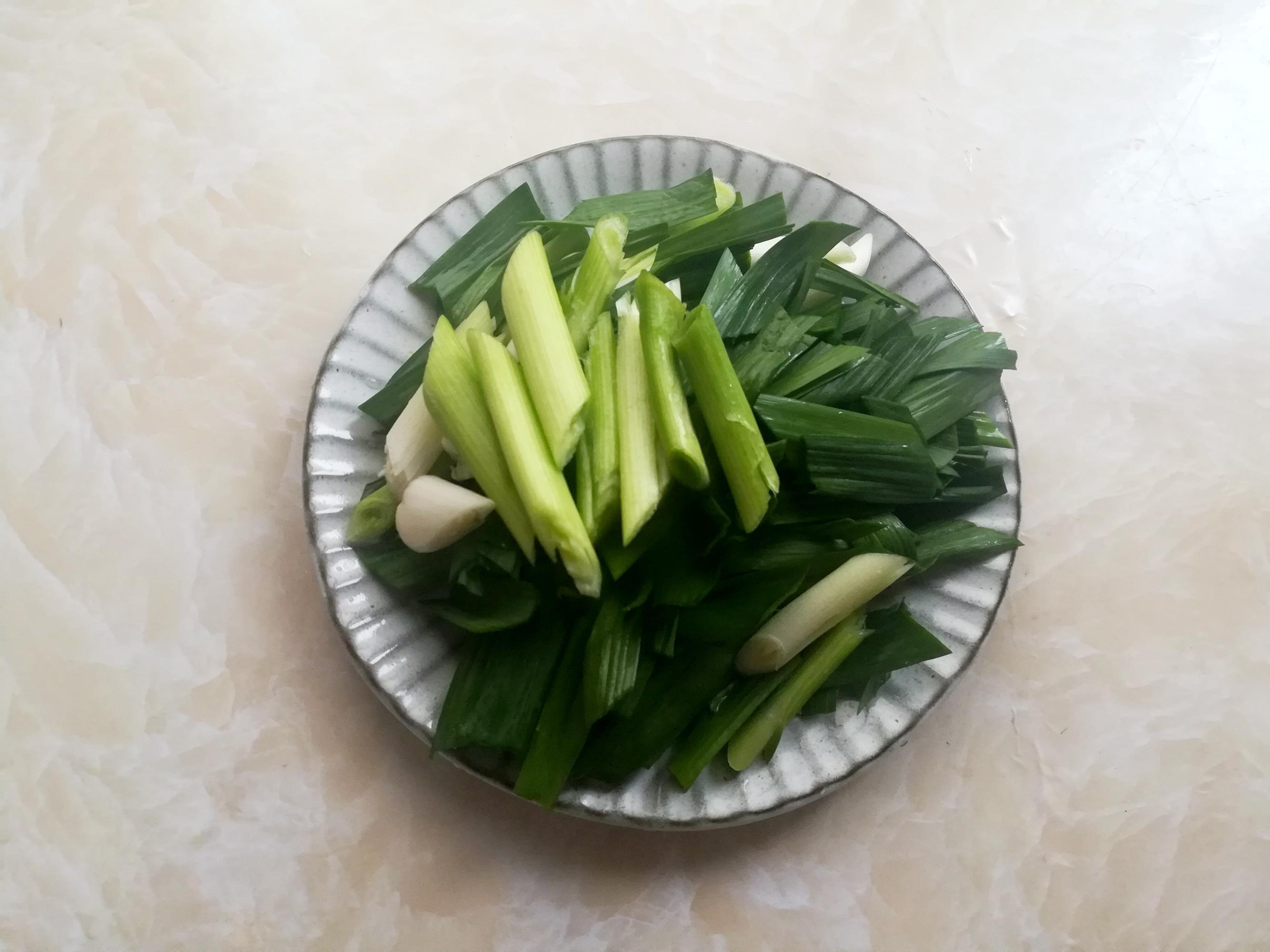 做法:1、香蒜去掉根鬚,清洗乾淨,切成小段,蒜白和蒜葉分出來。