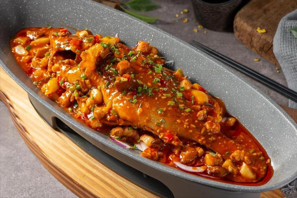 2、留底油,煸香五花肉和香菇,再把蔥薑蒜、小米椒放進去,接着來1勺豆瓣醬,加上1碗清水,用白胡椒粉、生抽、鹽、白糖、醋調味後,把魚放進去。大火燒開後轉中火,不停的往上面澆汁,煮上20分鐘,就可以出鍋了。
