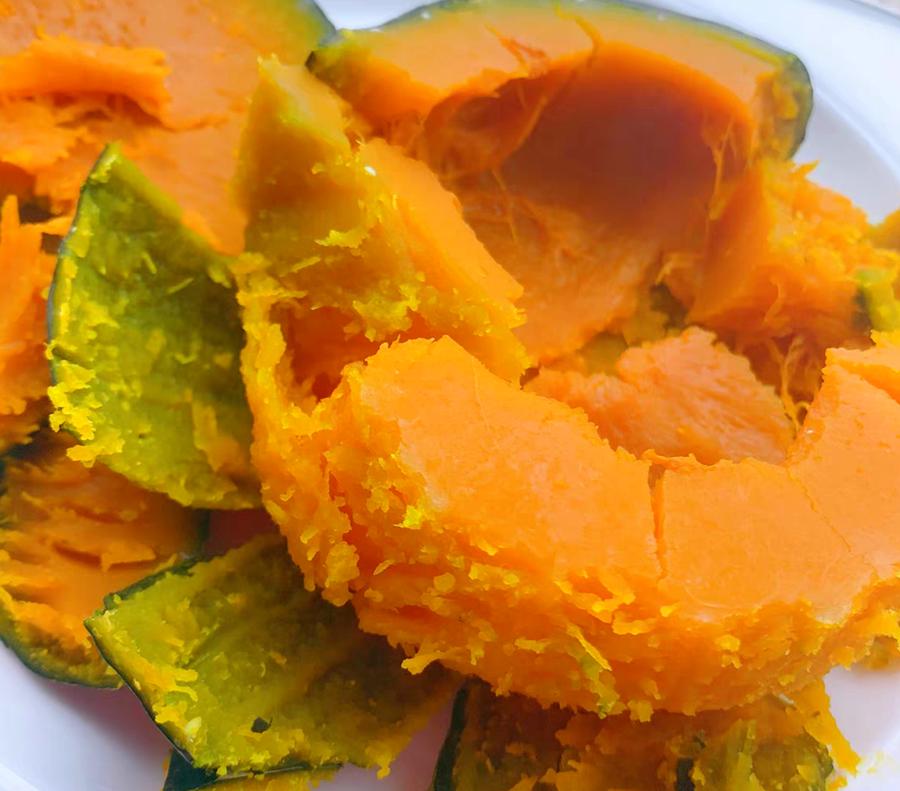 1.將南瓜清洗乾淨後對半切開,將中間的籽挖出來不要,然後切成小塊,放入盤中。