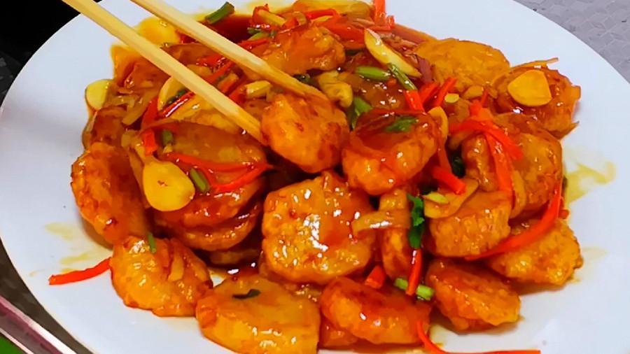 5.再起鍋加油,下入蔥、姜、蒜和胡蘿蔔絲,炒香後再倒入調好的糖醋汁,燒至冒泡後倒入山藥片,翻炒至山藥片吸收湯汁入味後關火,再撒上一把香菜末,就可以關火出鍋了。