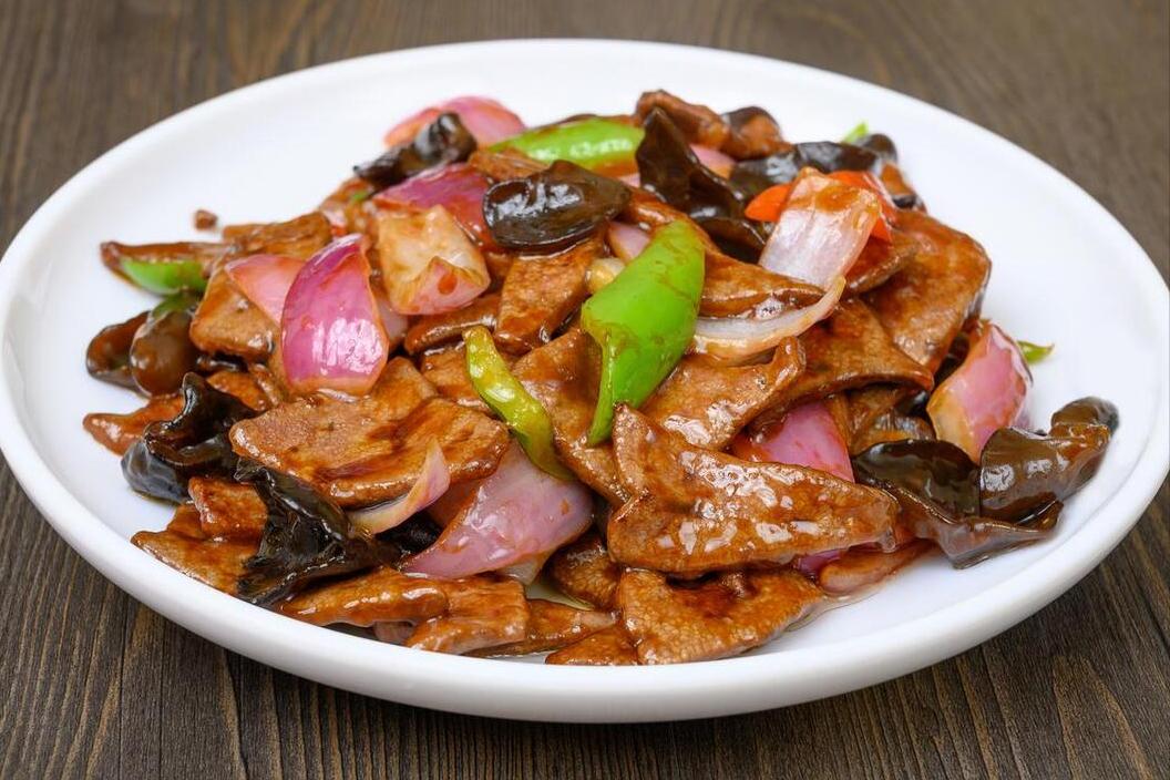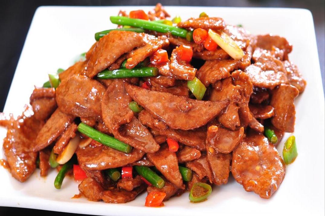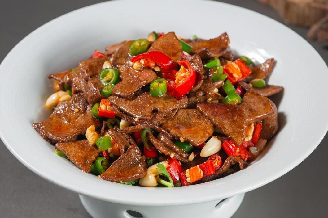 2、鍋中倒入適量的油,燒熱後下入豬肝快速翻炒,炒到變色後盛出來。然後重新起油鍋,下入蔥薑蒜、泡椒炒香,來1勺豆瓣醬,接着下入洋蔥、青紅辣椒略微翻炒兩下,再將豬肝倒進去,用醬油、蠔油、鹽、雞精調味,翻炒均勻即可出鍋。