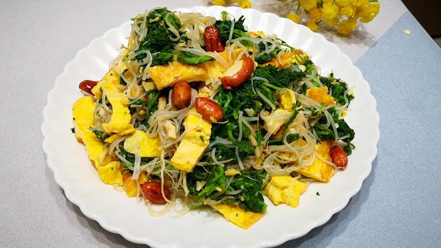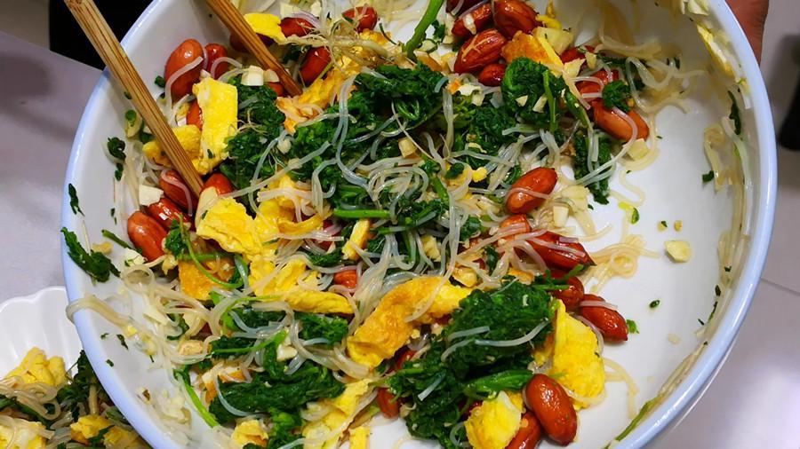 4.麥蒿過涼後控幹水分,切成小段後放入盆中,然後再把準備好的配菜加入,再加入蒜末、淋入適量的生抽、味極鮮、蠔油、香油,香醋,加入白糖和食鹽,攪拌均勻後直接裝盤即可,鮮美極了!