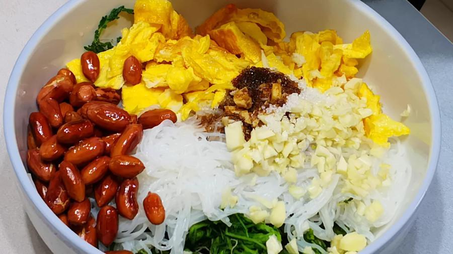 一把粉絲洗淨後放入鍋中,加入適量的冷水,煮至粉絲變軟後撈出過涼,控幹水分後切成小段備用。