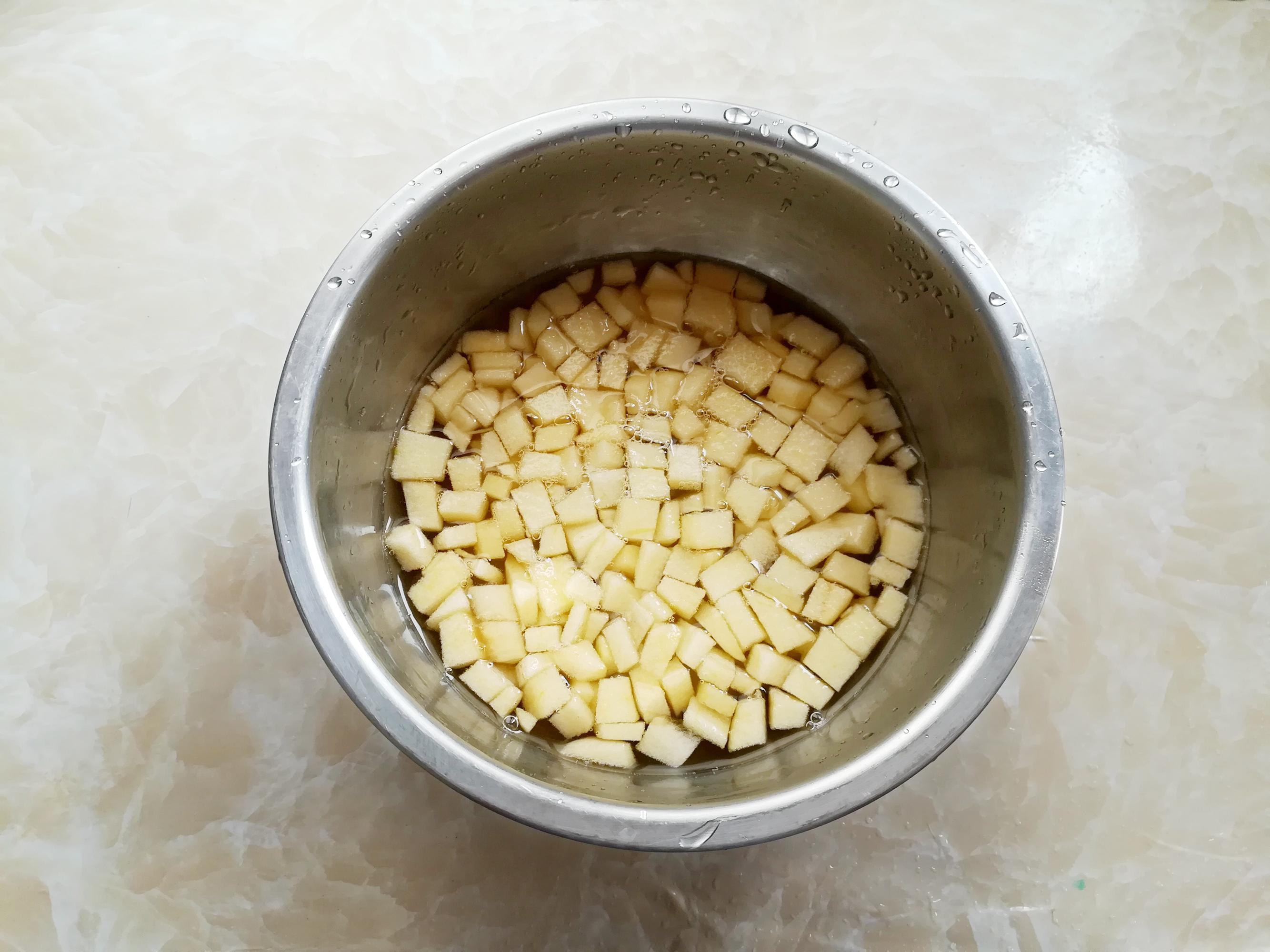 2、熬小米粥的同時,把蘋果去皮去核,切成大約1釐米的小方塊,放入水裏泡一會兒,防止氧化變色。