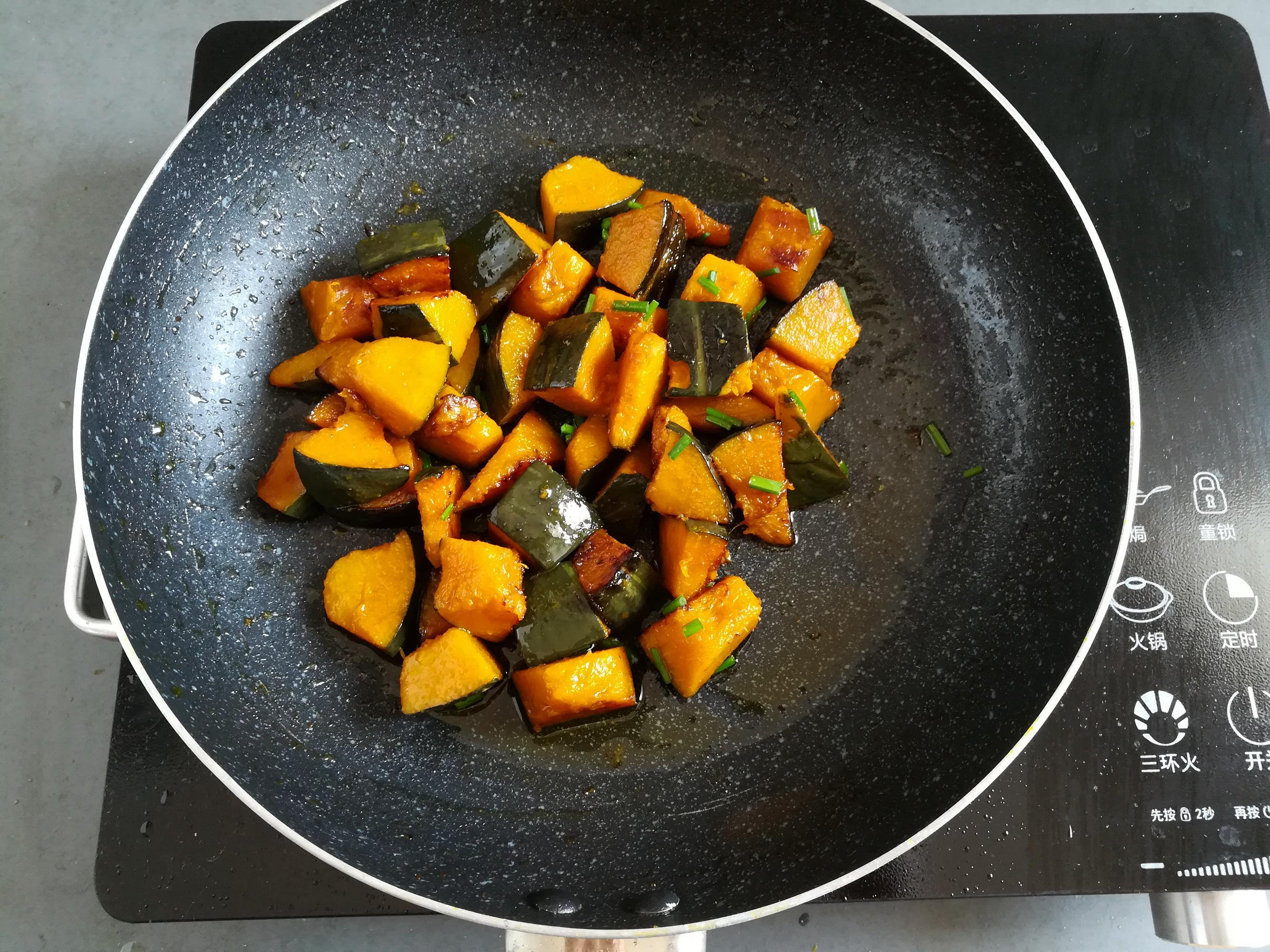 3、燜熟的南瓜加適量的鹽調味,撒上韭菜薹翻炒斷生就可以了。