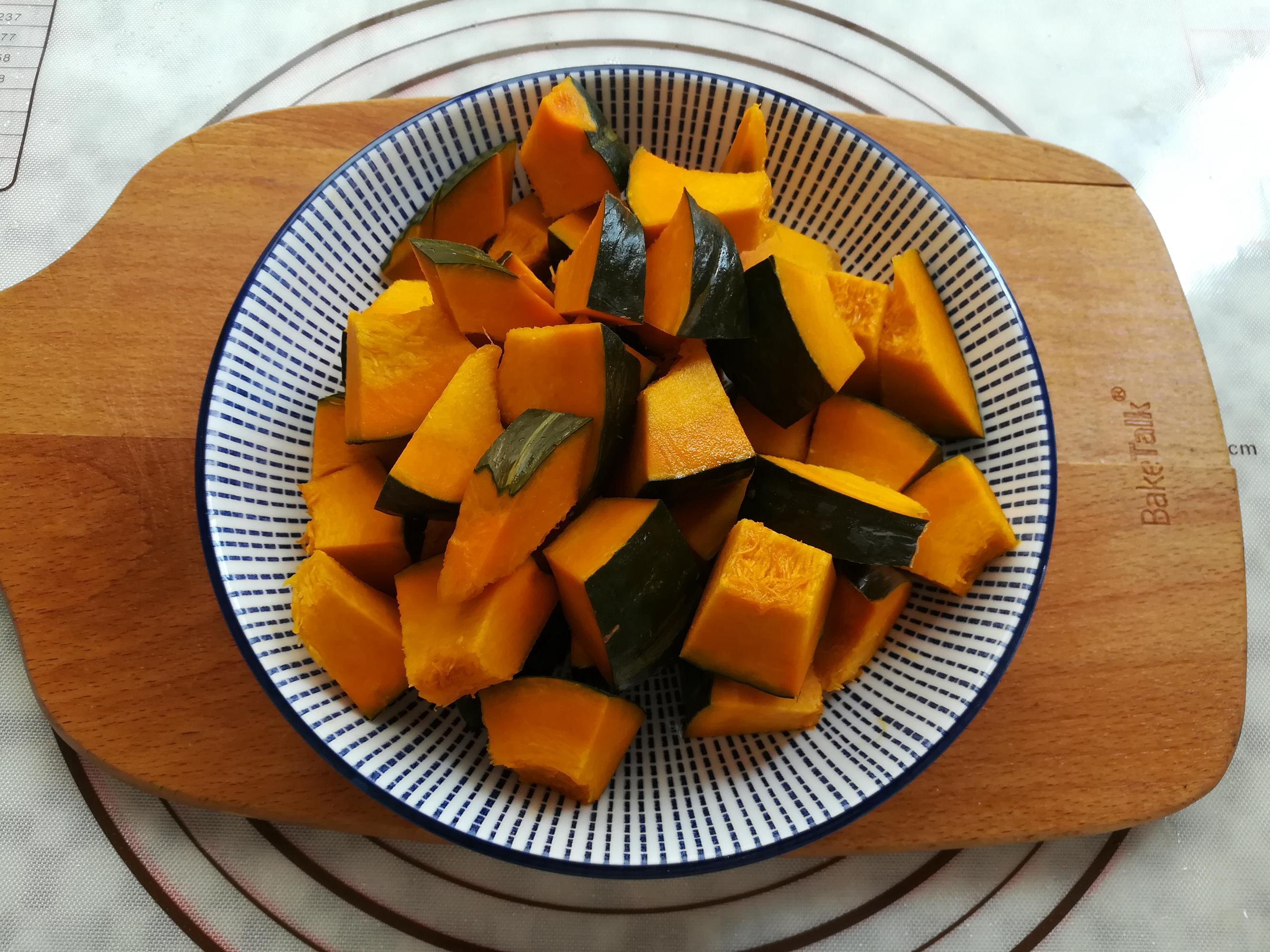 做法:1、貝貝南瓜清洗乾淨外皮,切開後去瓤去籽,切成2-3釐米的方塊,韭菜薹切成小顆粒。
