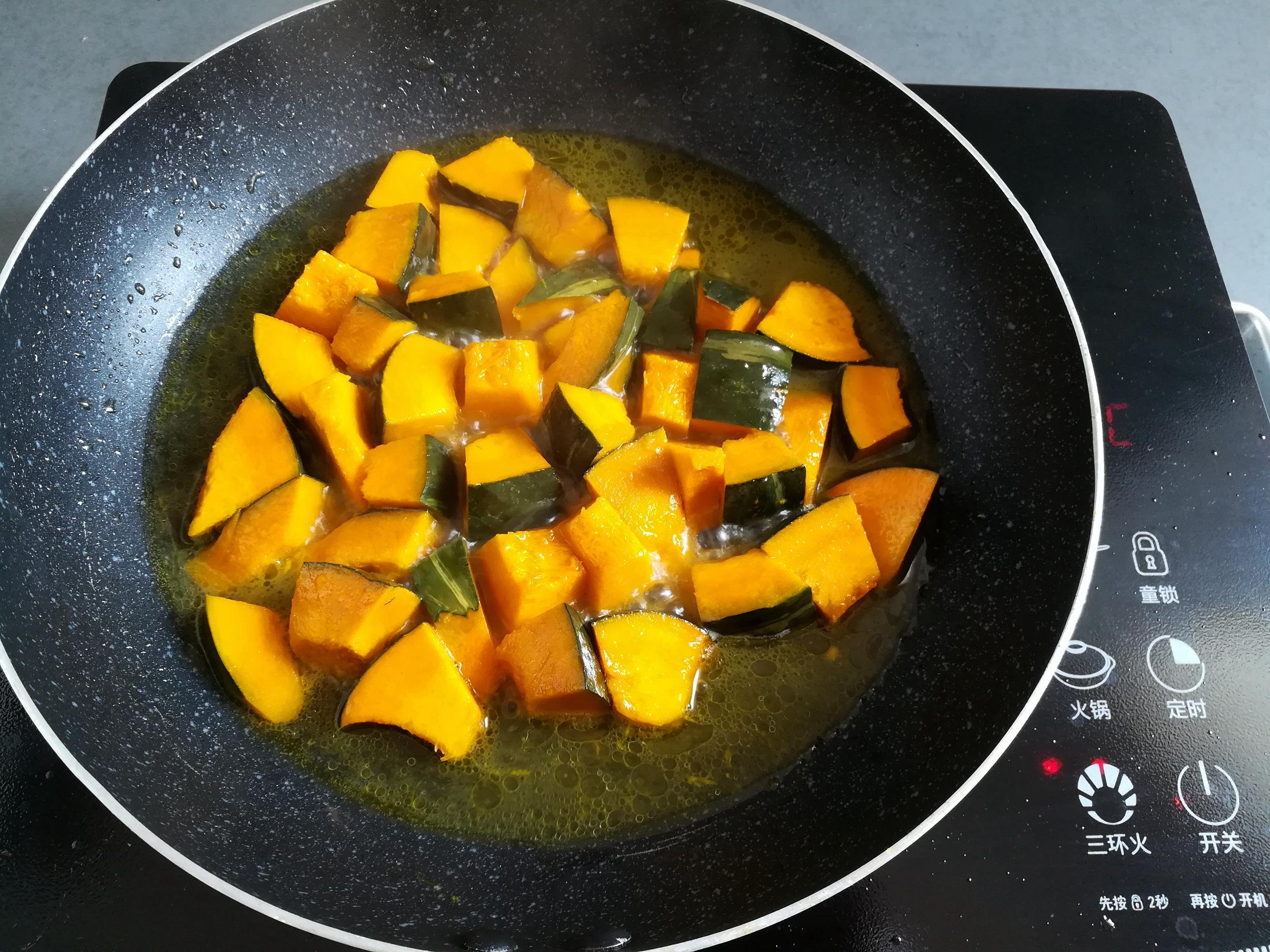 2、熱鍋放油、放入南瓜塊翻炒一下,加半碗水燜10分鐘左右。
