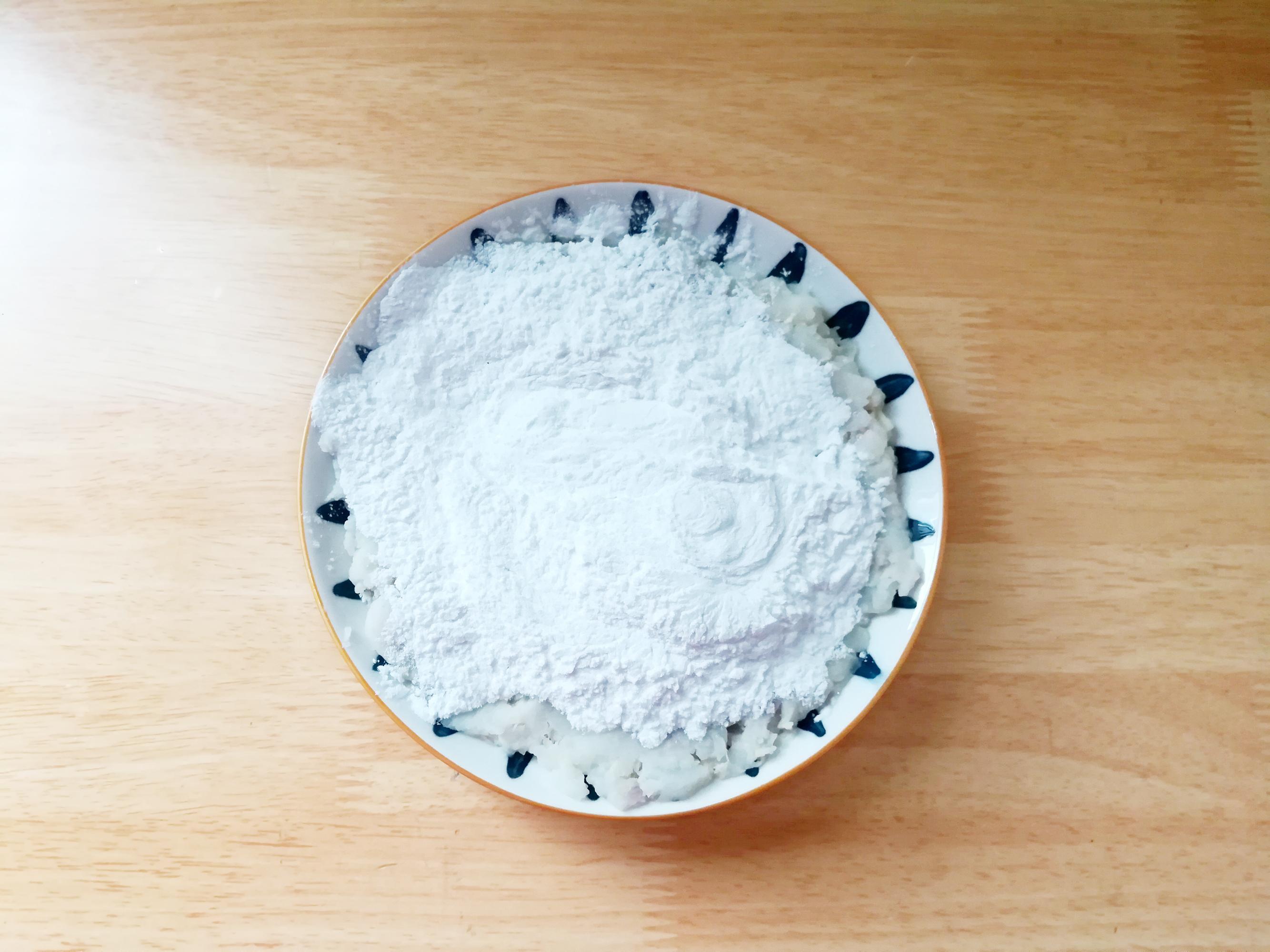 2、山藥用勺子壓成細膩的山藥泥,少量多次加入玉米澱粉,揉成光滑的麪糰。