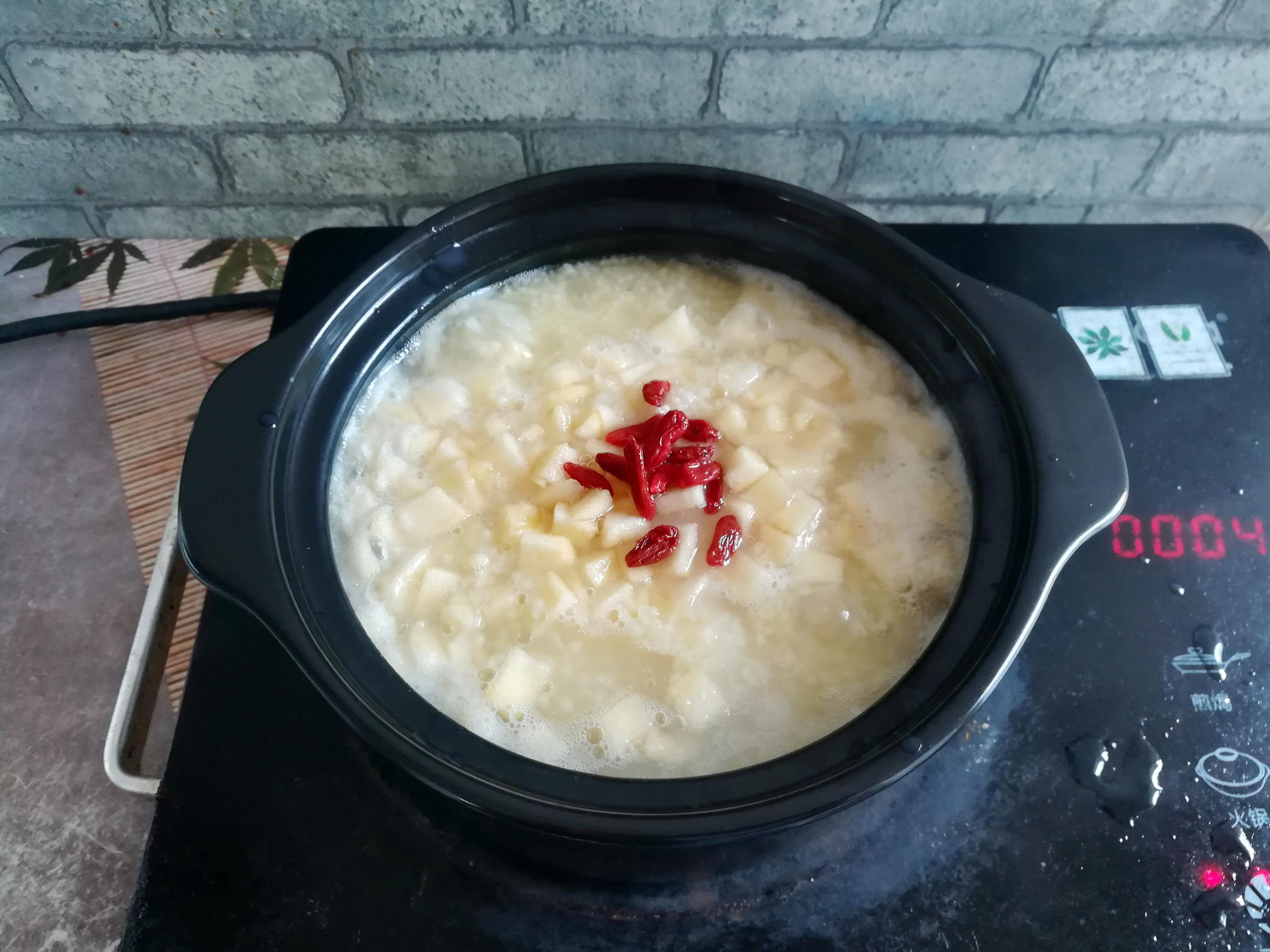 3、小米粥熬出米油,加入蘋果塊中火煮10分鐘,加適量的碎冰糖調味,撒上枸杞攪拌均勻。