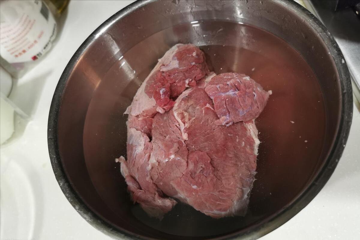 2、牛肉,是不需要焯水的,而是直接泡在水裏,泡上半小時的時間,這樣牛肉充水後會非常軟爛,而且腥味也帶走了,這是第一招。再把西紅柿、胡蘿蔔、土豆、蔥姜等,這些配料切好。