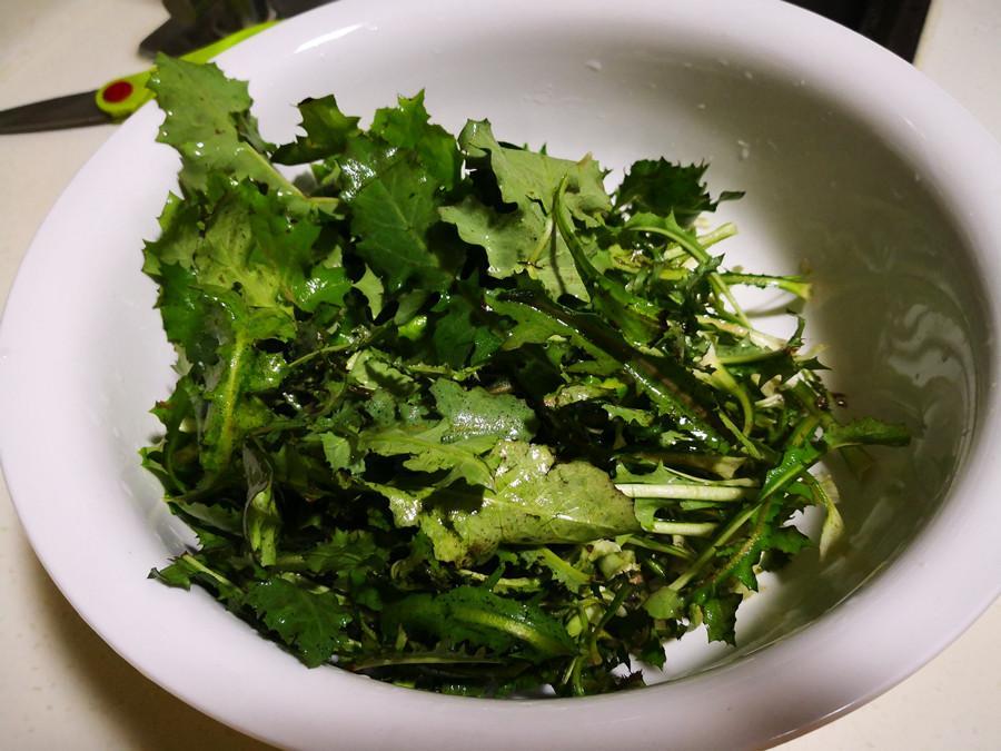 2.洗淨的苦菜爲了喫着更放心,我們再把它放到淡鹽水中浸泡十分鐘左右,去除農藥殘留和蟲卵。