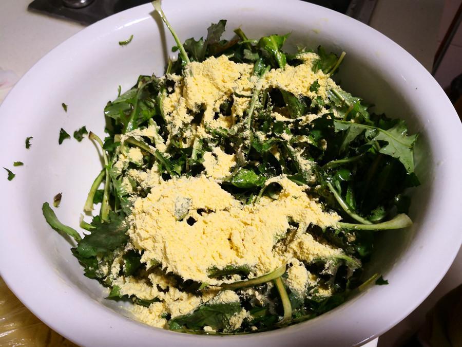 5.接着磕入一個雞蛋,攪散後再分別加入適量的玉米麪和普通白麪,比例約爲1:3,,一邊加一邊用手不停地抓拌,將苦菜抓散,讓每根苦菜上都均勻地裹滿面粉,最後再抖一抖,把多餘的麪粉抖掉。