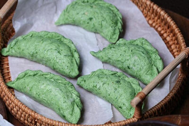 2、擠幹水分後,放入料理機中打碎,盛出來和糯米粉混合,然後用適量的開水來和麪,揉勻後分成數個小劑子,每一個都揉圓,然後在裏面加上剛纔的餡料,捏緊後按扁成餅狀。葉子上塗上少許食用油,然後將艾草餅放上去,隔水蒸15分鐘左右,即可開喫。