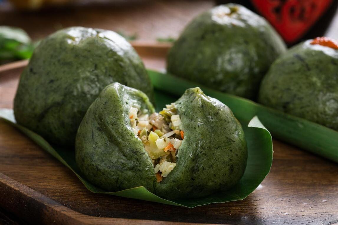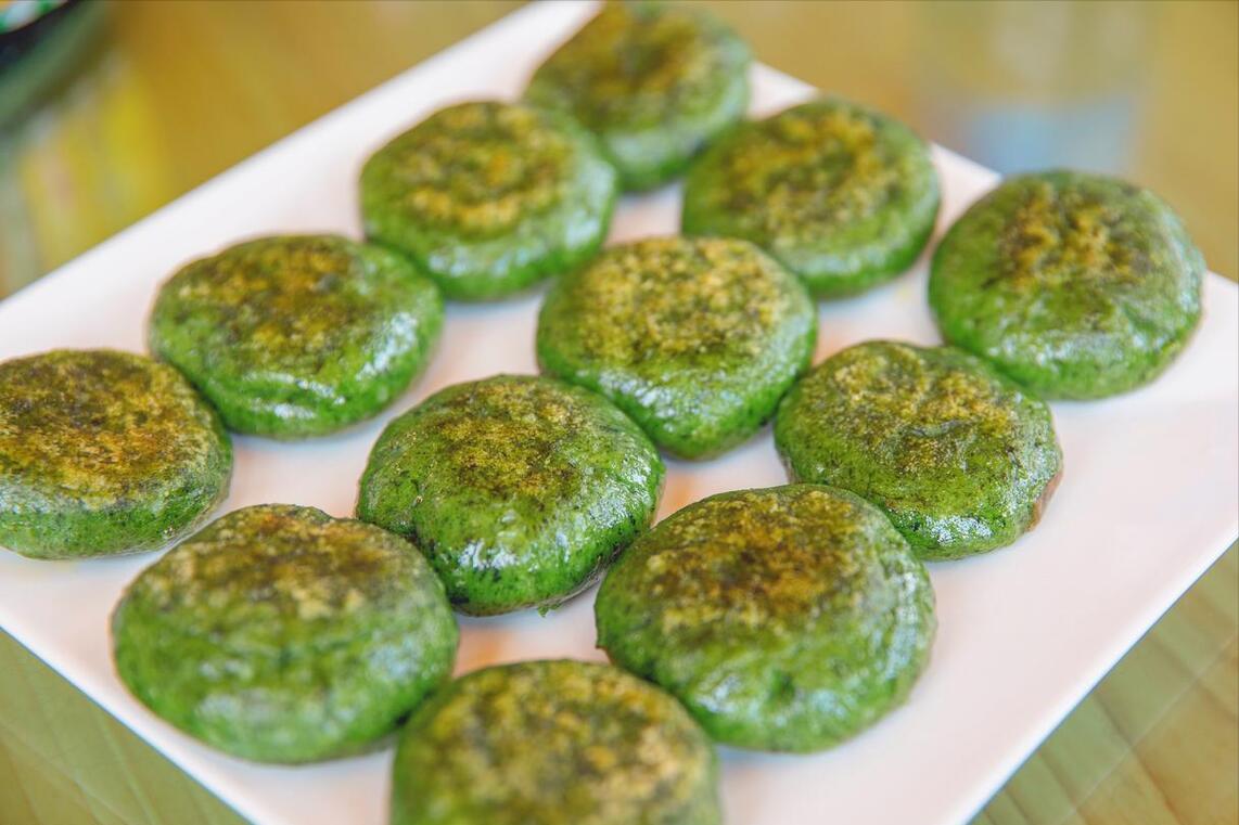 食材:艾草100g、糯米粉200g、花生仁、黑芝麻、紅糖、葉子