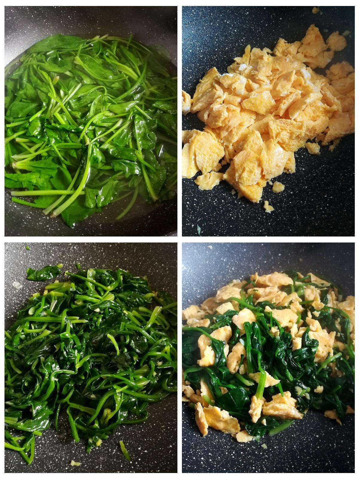 3、熱鍋放油,放入菠菜,加入炒好的雞蛋碎,翻炒均勻,加適量的鹽調味。