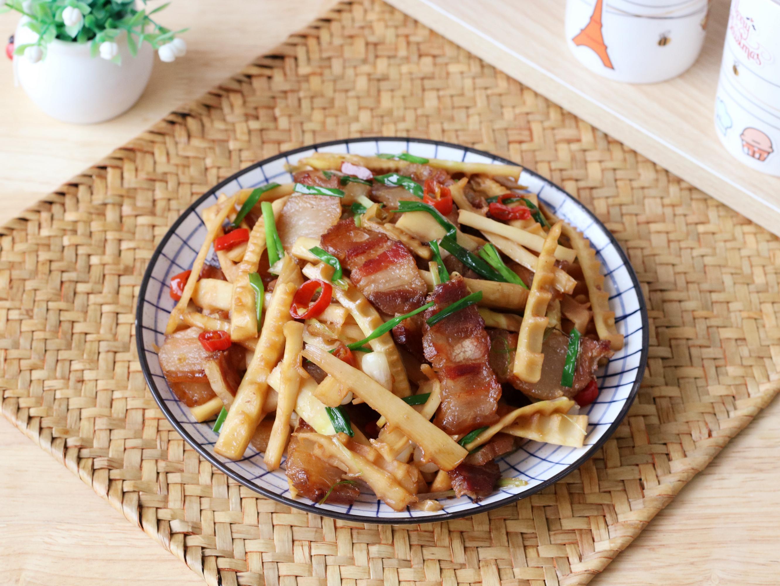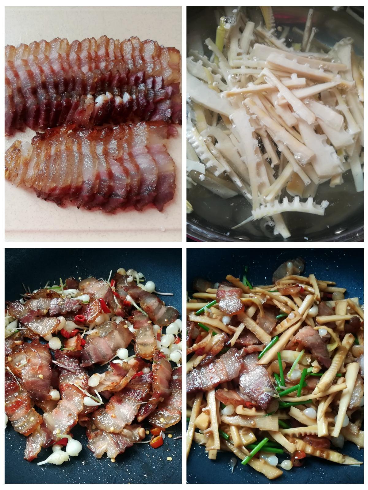食材:春筍、臘肉、辣椒、野蔥、食用油、鹽