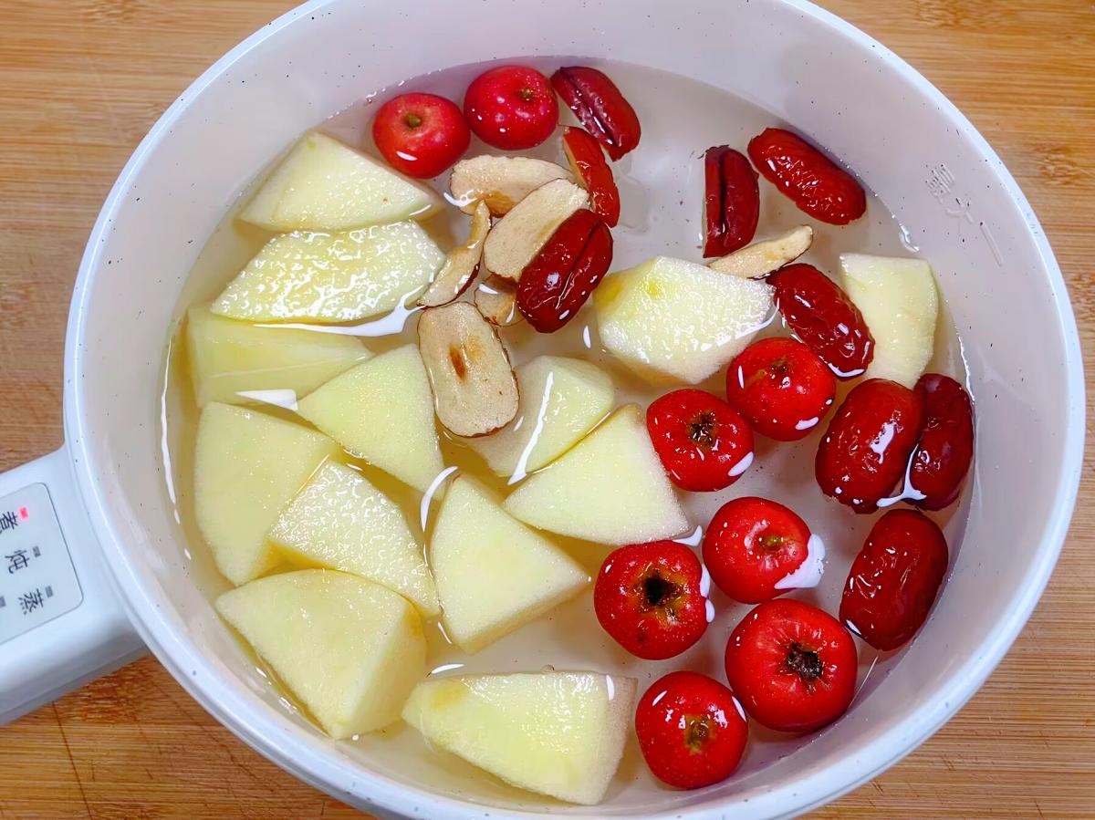 三、蘋果山楂紅棗湯的做法:在一個鍋中加入適量清水,放入準備好的蘋果塊、山楂和紅棗,然後加入適量的冰糖。將鍋置於爐火上,用中小火煮熬,待水煮沸後轉小火慢燉。