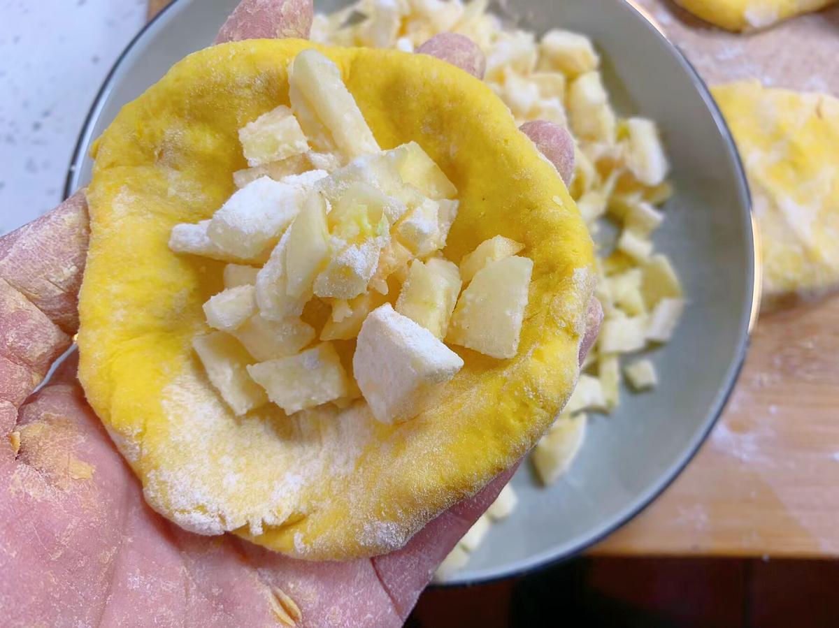 將發酵好的麪糰取出,揉成長條狀,然後分割成若干小份,擀成薄面皮。將蘋果碎塊放在麪皮上,然後包裹成餡料餅。注意封口要捏緊,以免餡料漏出。在電餅鐺中倒入適量的植物油,加熱至適中溫度。將包好餡料的餅放入電餅鐺中,煎至兩面金黃,表面酥脆即可。
