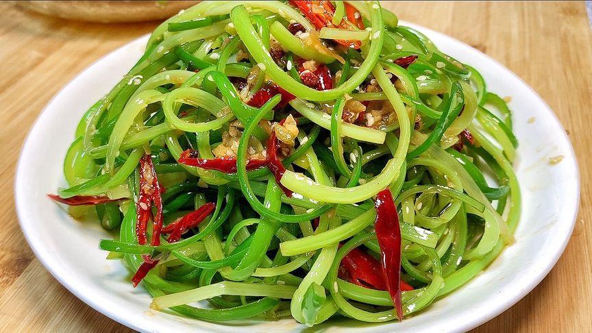 2、然後把蒜薹撕成絲,調味加蒜末、食鹽、雞粉、白糖、白醋、芝麻香油,,澆上熱油攪拌即可。