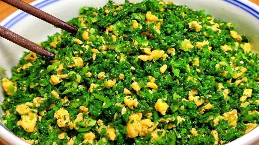 1、先把薺薺菜焯水30秒,然後撈出放入盆中過一下涼,再把多餘的水分稍微攥一下,再切碎。裏面打入6顆雞蛋。再加入一勺鹽,攪拌均勻,油溫燒熱以後,倒入雞蛋液,用筷子將它炒成雞蛋碎,炒的越碎越好,炒好關火晾涼備用。