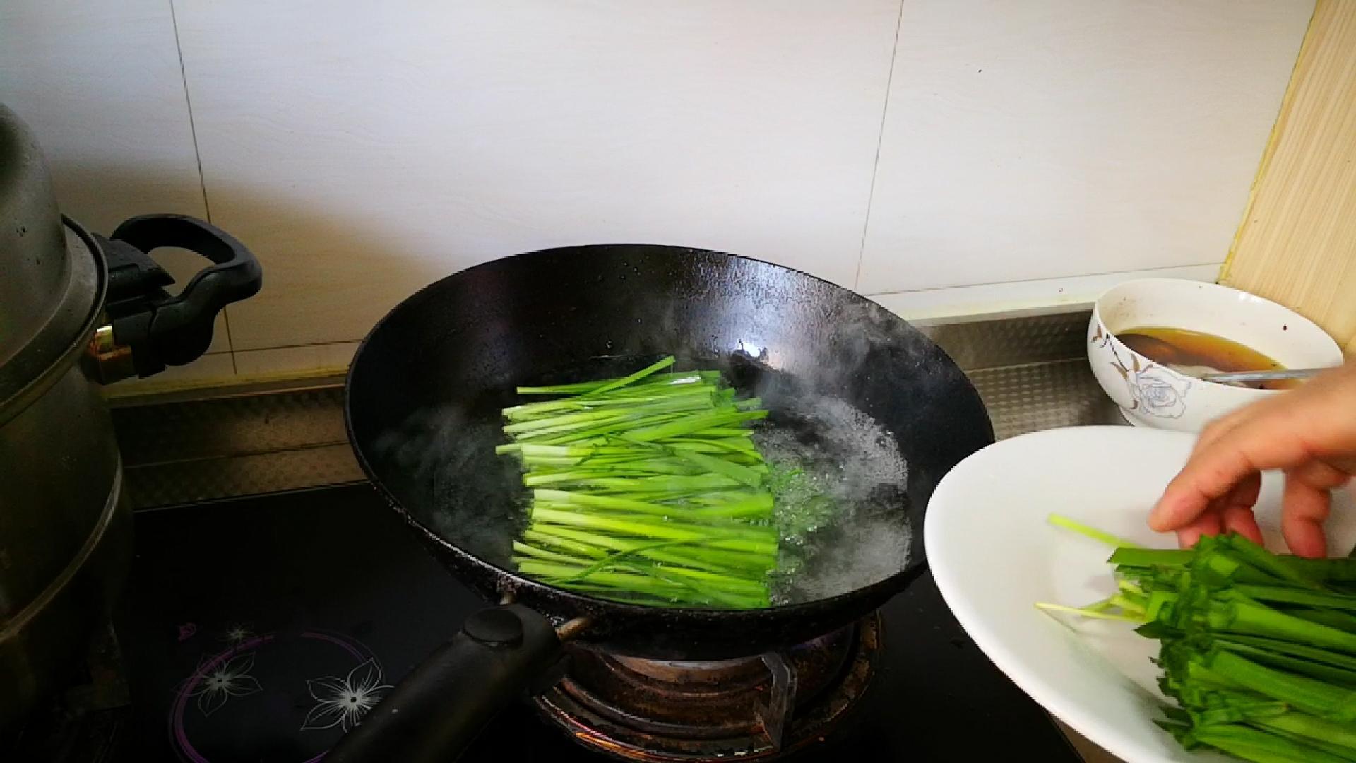 4.起鍋加水,燒開後先加入一匙食鹽、再滴入幾滴食用油,然後放入韭菜頭焯燙一下,大約焯水10秒後再放入韭菜葉子,繼續焯水10秒後撈出韭菜段過涼開水(過涼水可以使韭菜顏色保持翠綠不發黃),再控乾淨水分後裝盤,然後把調好的涼拌汁倒入,用筷子翻拌均勻,讓韭菜充分吸收料汁入味,美味即成。