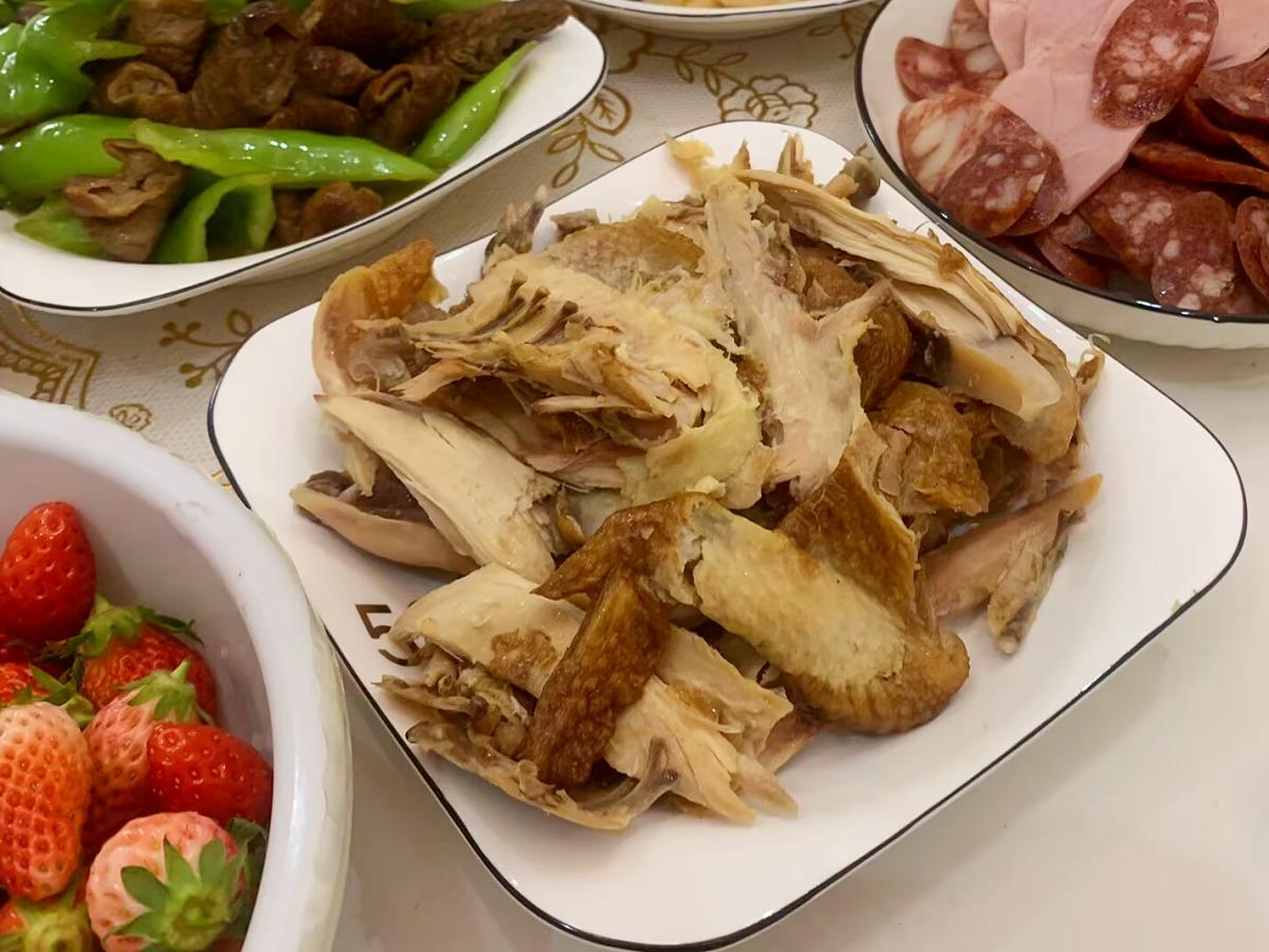 扒雞是婆婆從老家帶來的,這是老公最愛喫的肉食,開袋直接食用的,把它分成小塊,放入盤內端上桌,下酒又下飯。