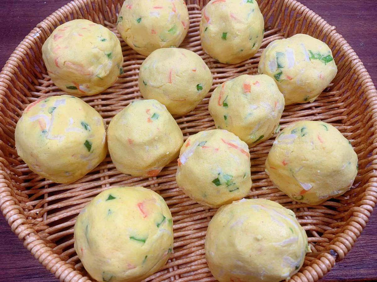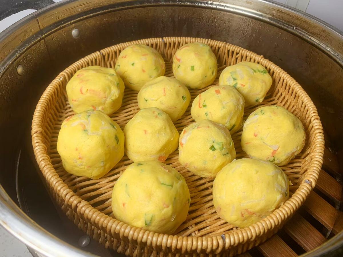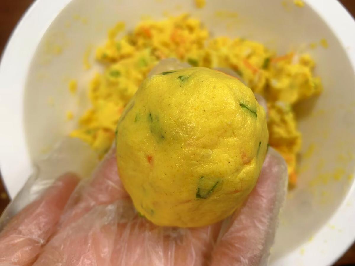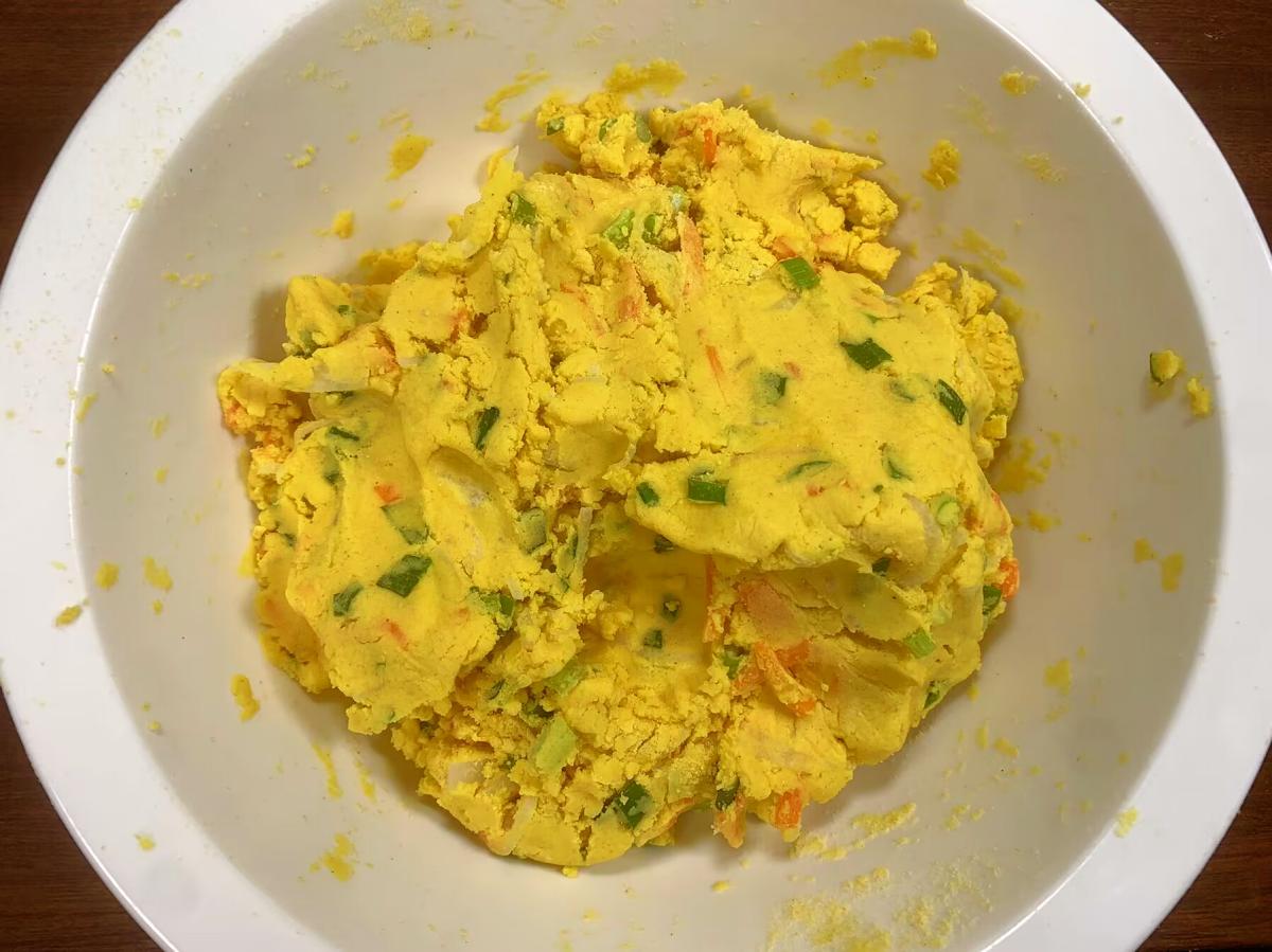 3、食材全放好後,下手不停地掐拌,不停地揉掐,使蔬菜和玉米麪均勻地融合到一起。玉米麪不像麪粉,不需要醒發。
