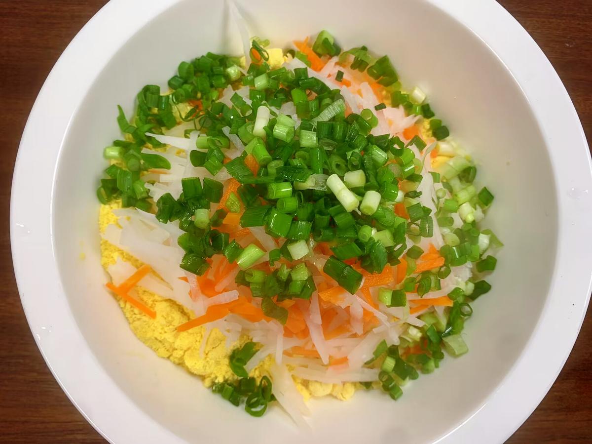 2、盆內舀入3大勺玉米麪,(玉米麪有粗細之分,最好選用粗玉米麪,喫着更香)把胡蘿蔔絲、白蘿蔔絲、一小把切碎的小蔥段都放進去。